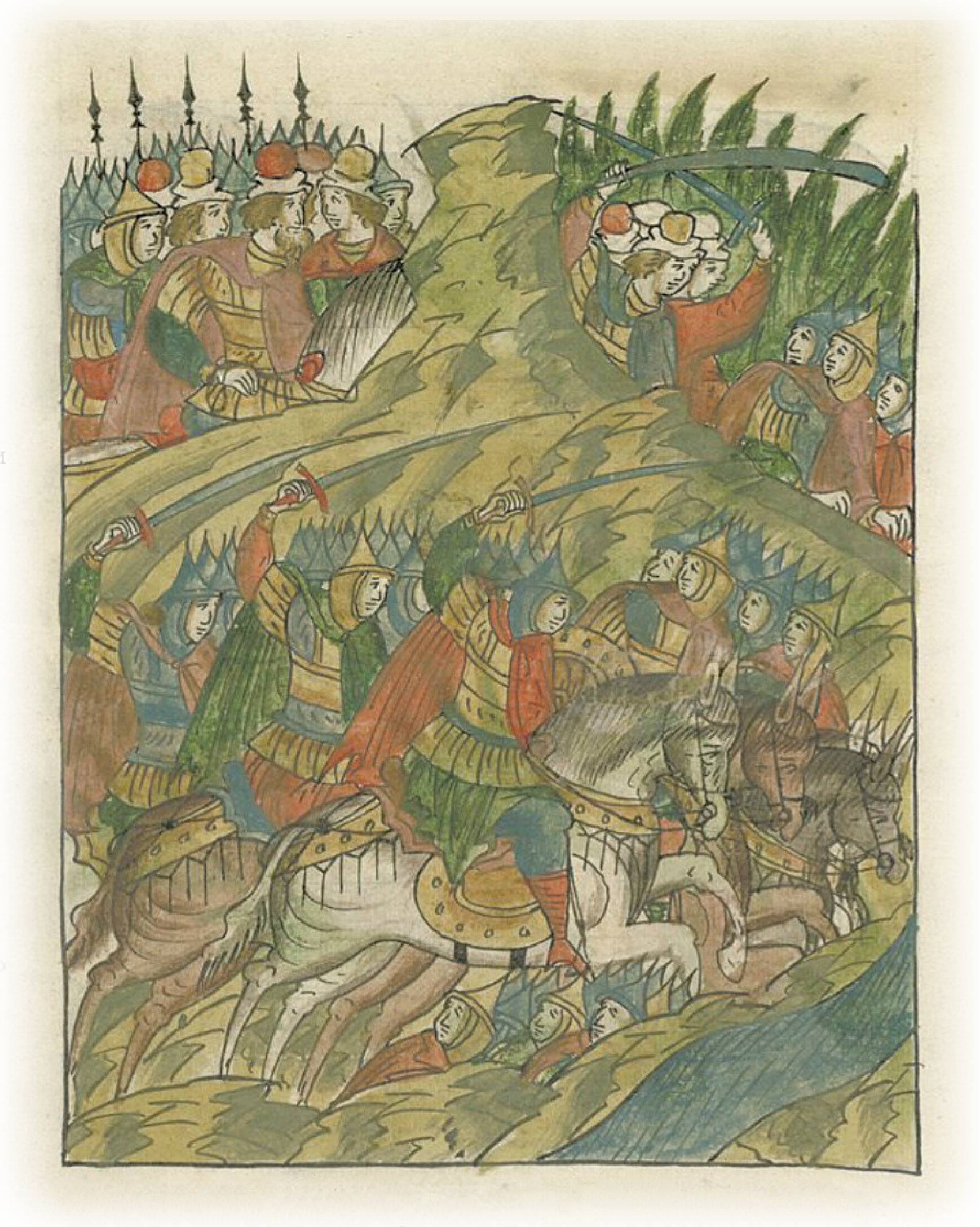 А люди, первыми от воевод пришедшие, конные, начали татар побивать: и по бродам, и по дорогам их били, и пешие люди окраинные по лесам их били.