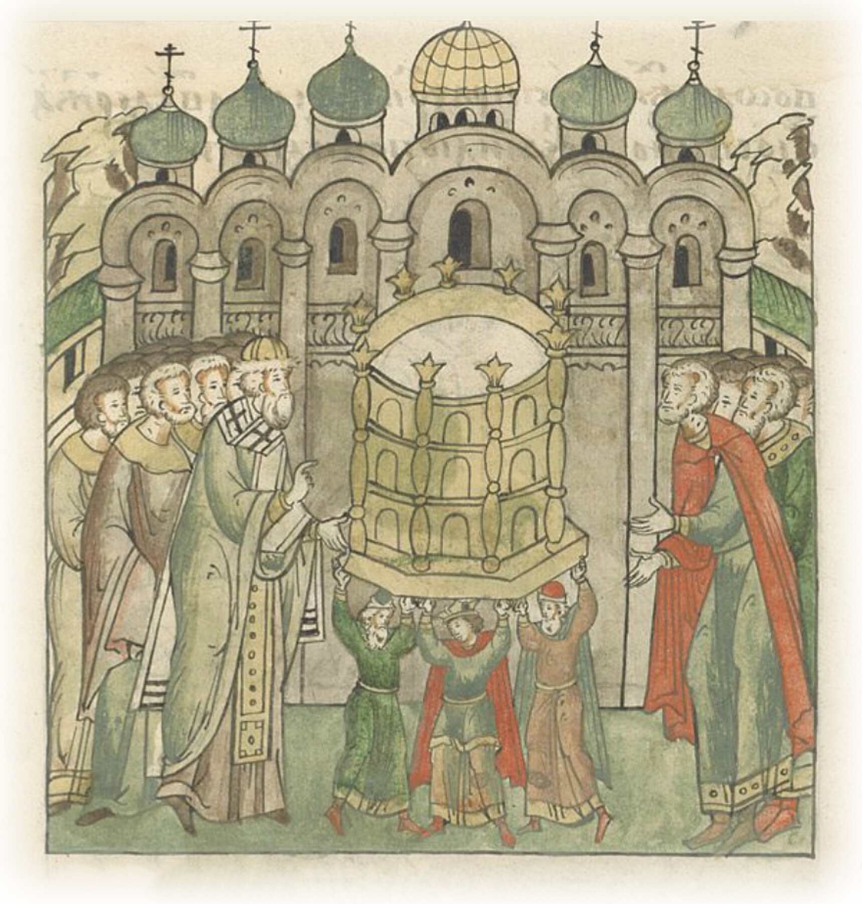 Об амвоне в Великом Новгороде. Тем же летом в июле в 15 день боголюбивый архиепископ Великого Новгорода и Пскова Макарий поставил в соборной церкви святой Софии в Великом Новгороде амвон весьма дивный и всякой красоты исполненный: святых на нем от верха в три ряда 30, на поклонение всем христианам. И весь амвон резьбой различной и золотом листовым преизящно украшен, а внизу амвона исполнены двенадцать людей* деревянных, разными красками украшенные, в одеждах, которые со страхом на головах держат сию святыню; и весьма приятно это было видеть. * скульптур.