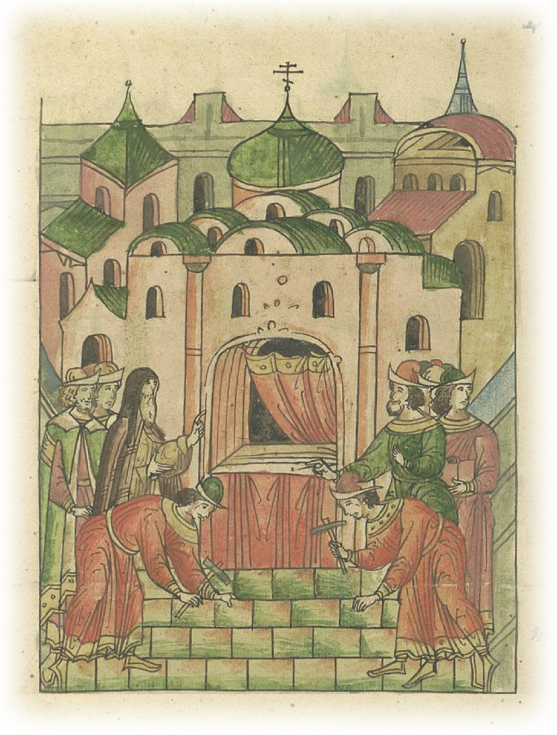 Тверской владыка Феодор выкладывает в соборной церкви святого Спаса мраморный пол.
