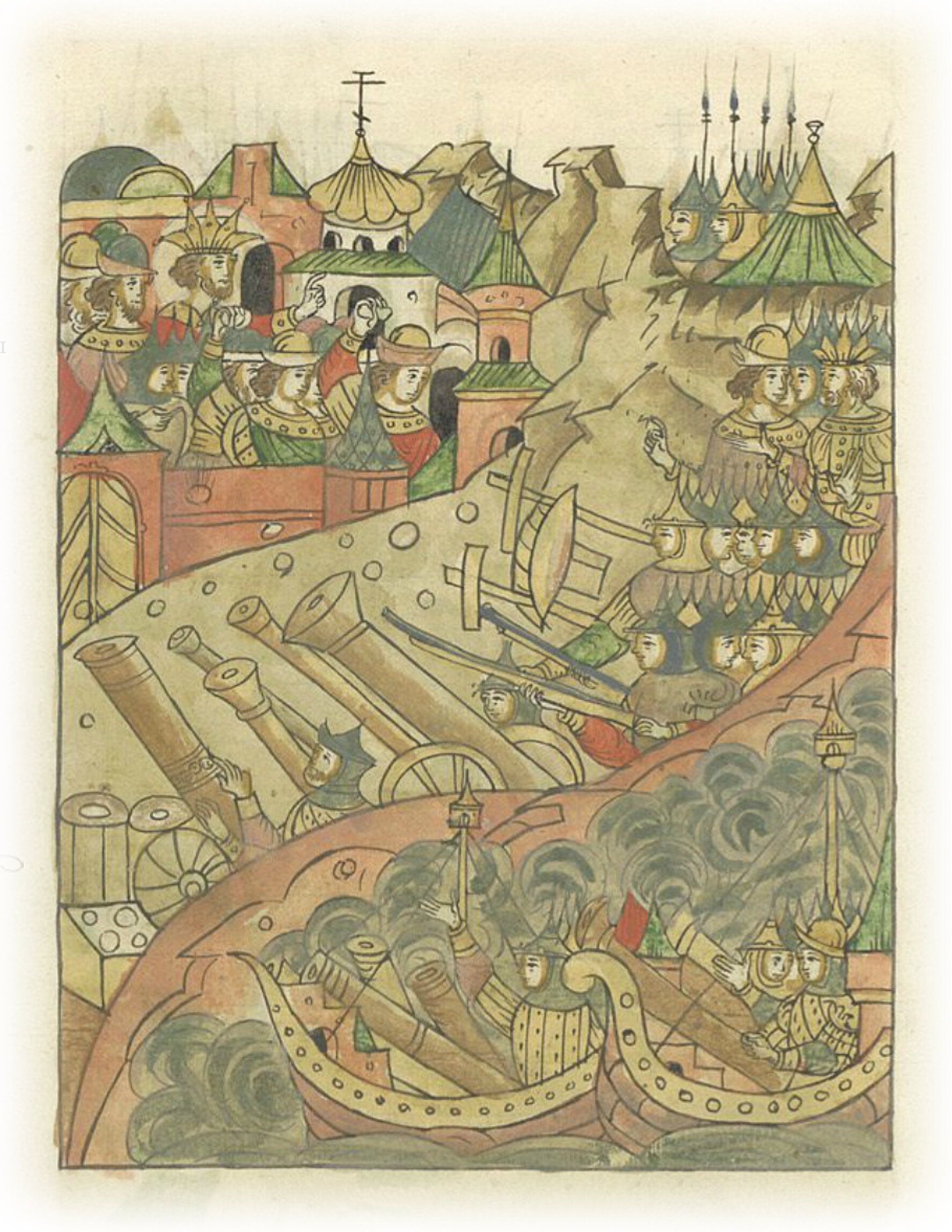 а сам с предивным, наполняющим страхом, ополчением двинулся по суше и по морю и приступил к Царствующему граду месяца декабря, повелев бить пушками и пищалями, и (разными) стенобитными приспособлениями и готовиться к штурму города.