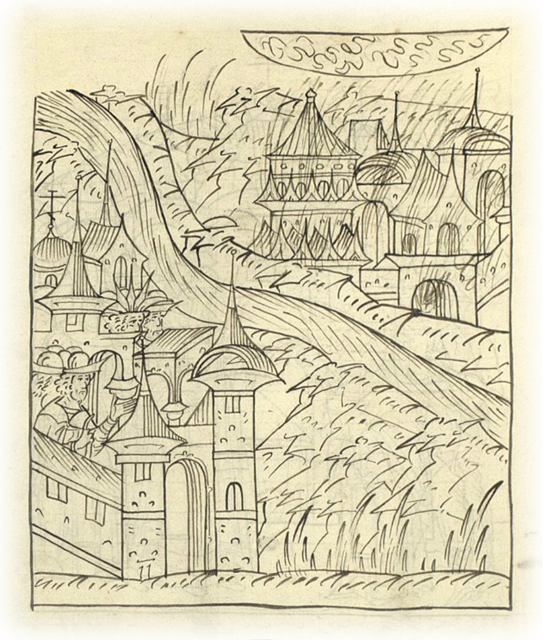 Сильный гром и молния, от которой сгорают терем и хоромы на дворе царя Ивана Васильевича в Воробьеве.