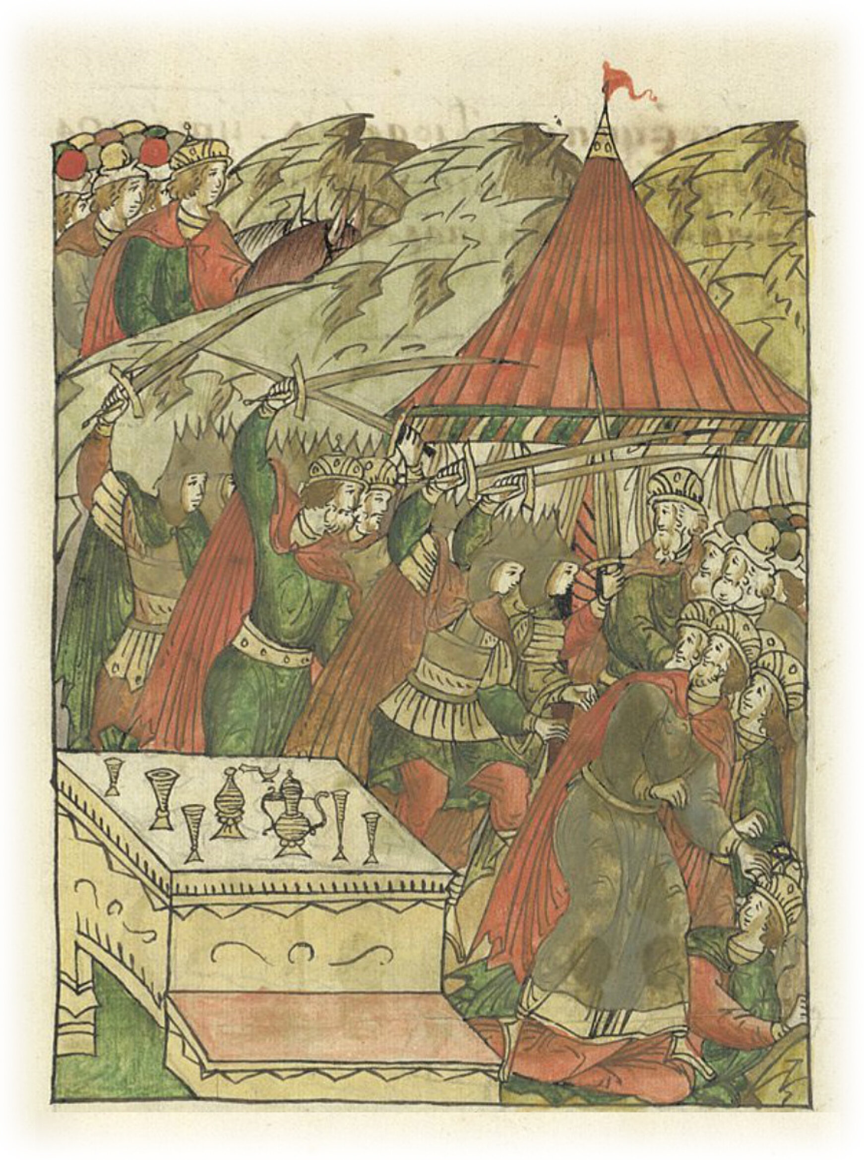 Пришли окаянные убийцы и начали сечь нещадно. И сами окаянные князья Глеб и Константин, взяв мечи, начали сечь князей и бояр их, и дружину их всю, и убили пять братьев, и шестого, брата родного князя Изяслава Владимировича. А князь Ингвар Игоревич, племянник их, не успел придти к ним на пир тот злой, не пришло его время. Так защитил его Бог и спас от лютой смерти.