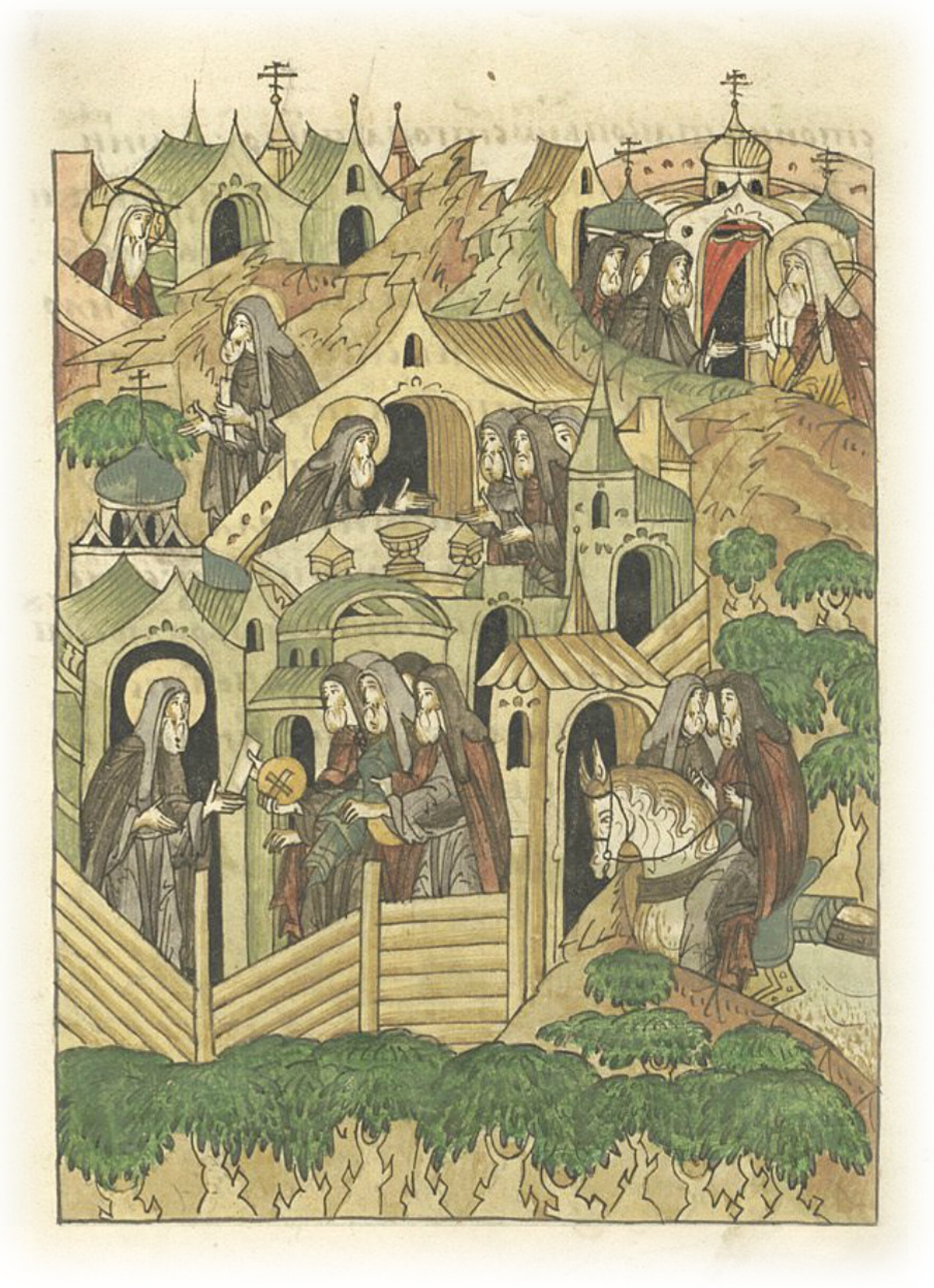 Повесть о преподобном Сергии Радонежском. Греки, послы Царьградского патриарха Филофея, приходят к преподобному игумену Сергию с благословением от патриарха, крестом, парамандом, схимой и посланием. Сергий, оказав им большие почести, велит остаться в мона