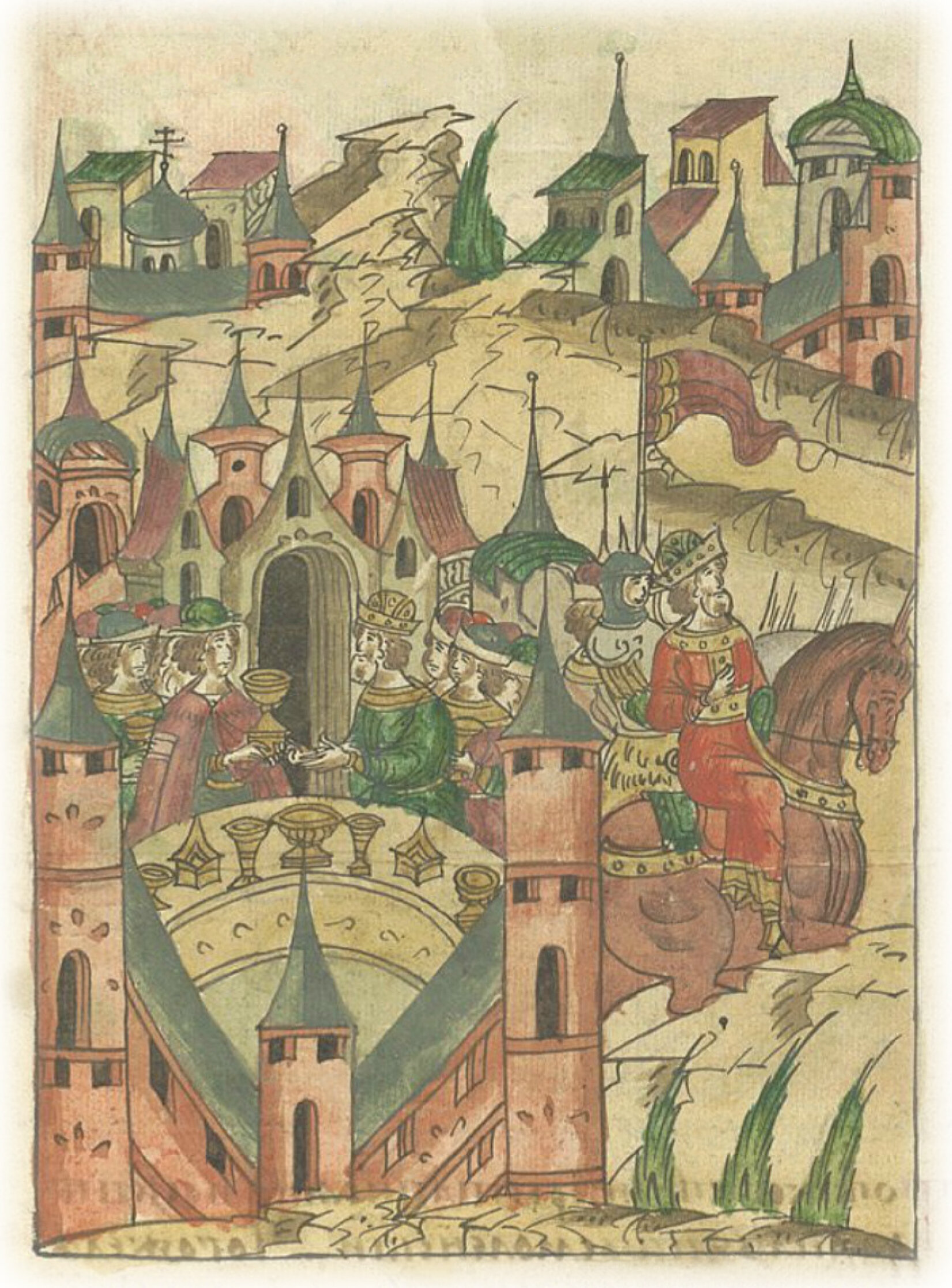 Литовский князь Витовт Кестутьевич принимает почести и дары от своего зятя, великого князя Василия Дмитриевича Московского, в Коломне.