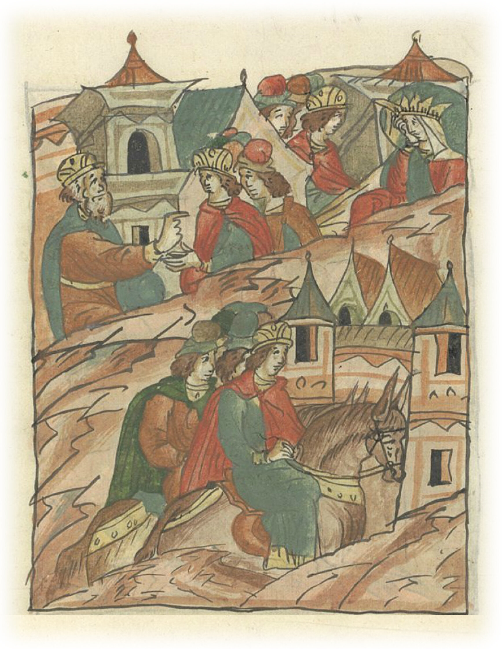 Случилось же ему тогда идти в Новгород на княжение по приказу своего отца, пришел он к своей матери, лежащей в болезни, как уже было сказано, семь лет, и, приняв от нее благословение, отправился в Новгород.