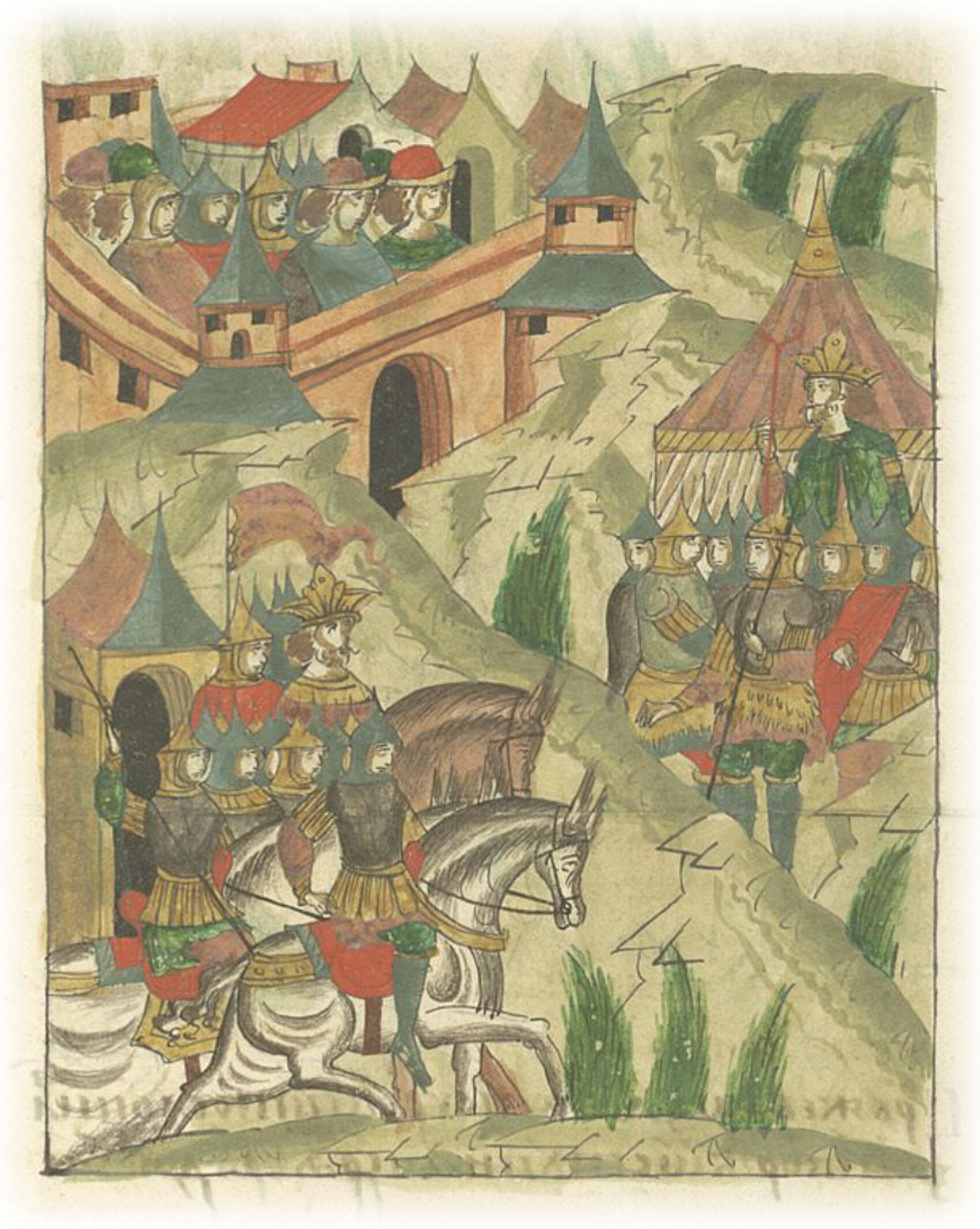Царь Темир-Аксак, желая завоевать Царьград, идет с войском на стоящего 7 лет под Царьградом Турского князя Баозита.