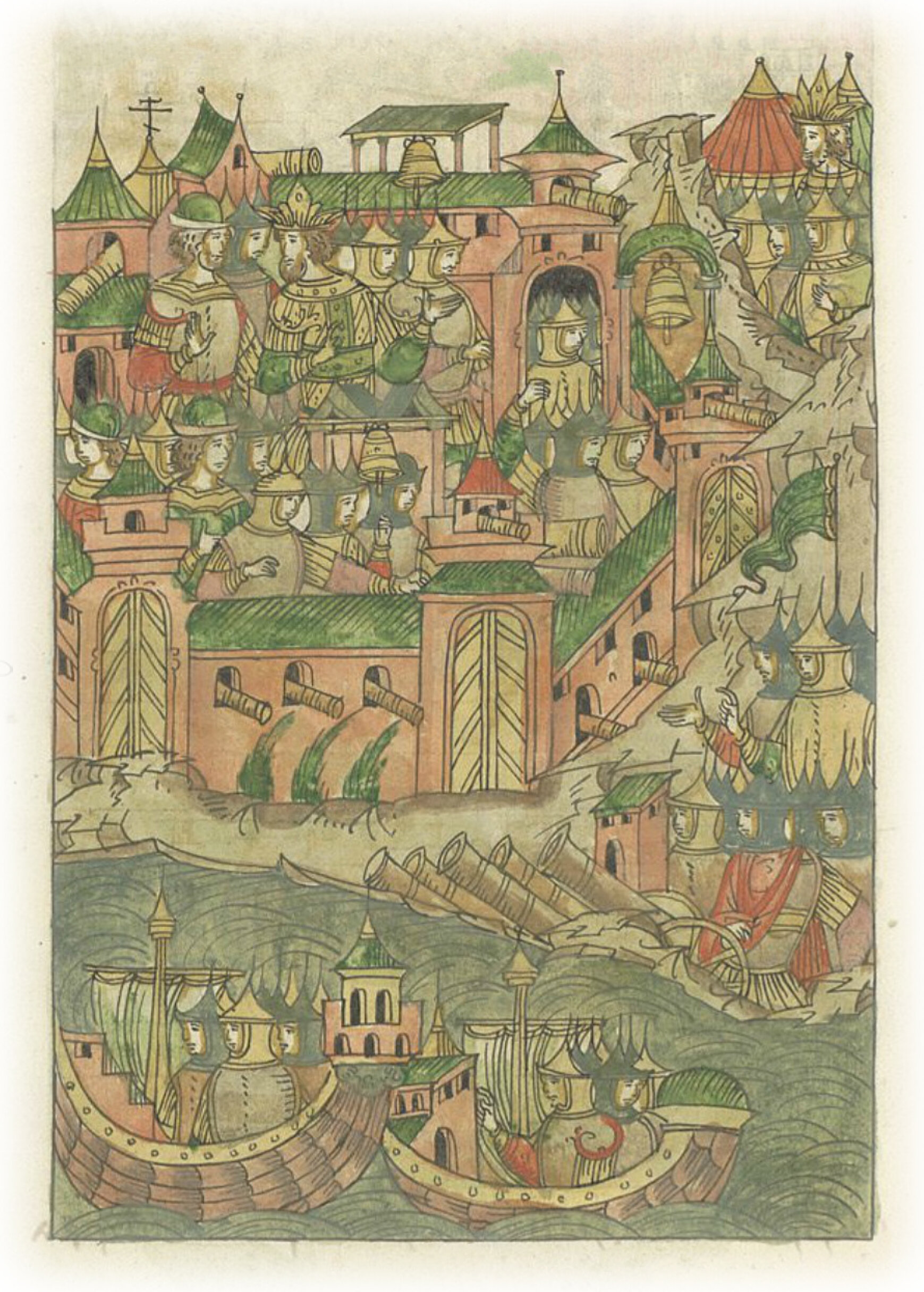 Увидев это, царь повелел вельможам и мегистанам разделить воинам городские стены, стрельницы и ворота, а также и всех людей, и колокола ратные на всех сторонах расставить, пусть каждый из них знает и охраняет свою сторону, и все, что нужно на бранную потребу, устраивает, и бьется с турками со стены, а из города не выходит и не выезжает. Также пушки и пищали велел установить по удобным для приступа местам, чтобы уберечь стены.