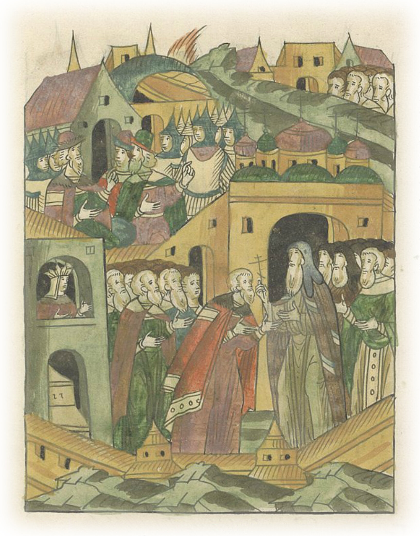 По благословению же преосвященного митрополита всея Руси Геронтия, и собравшегося об этом освященного собора, архиепископов и епископов, и всего священнического чина, также и по совету с матерью своей и по ее молитве, и по думе с братьями своими, и боярами своими, и князьями, и воеводами вооружается на свою отчину, на отступников, преступивших крестное целование, на новгородцев.