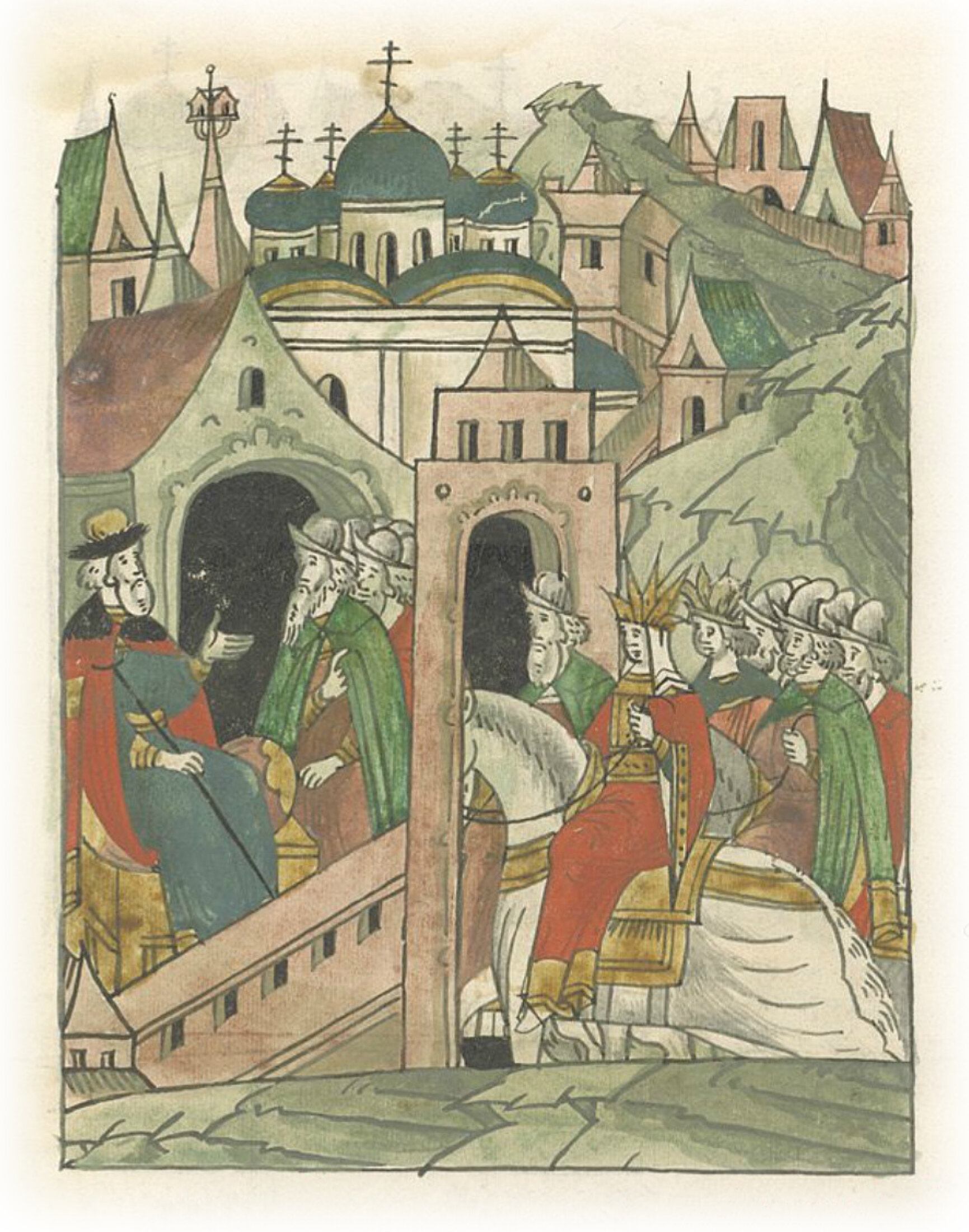 Ругодивские посадники Яким и Захар приезжают в Москву. Воеводы царя Ивана Васильевича Алексей Адашев и Иван Михайлов сообщают им, что государь пожалует их, если сдадут его воеводам помимо Ругодива Вышгород.