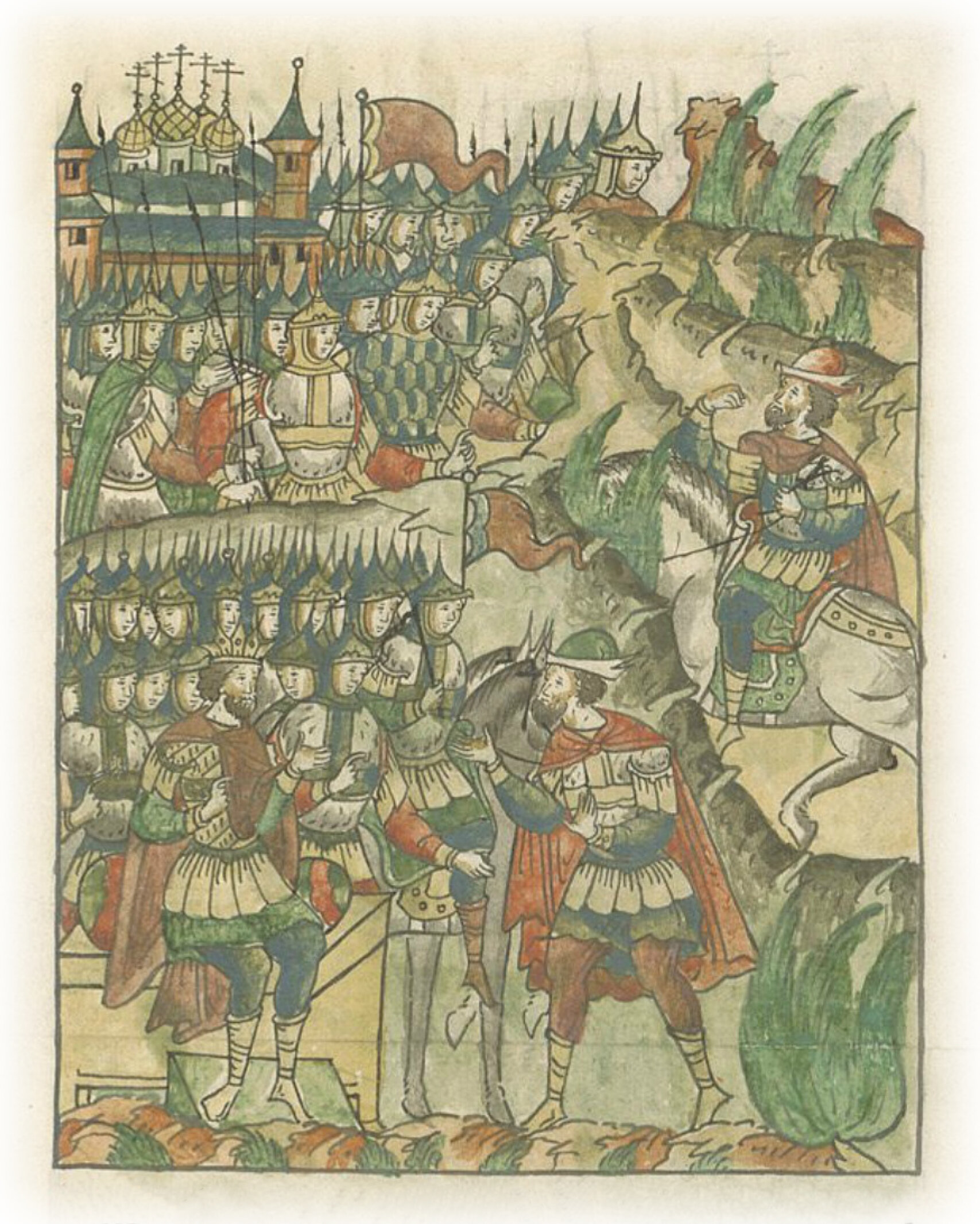 И в третий раз послал одного из ближних своих узнать истину. И тот пошел, и увидел неисчетное множество московского воинства, и ужаснулся и, трепеща, быстро прибежал с криками: «О, царь! Что медлишь? Бежим быстрее, не знаю, сможем ли убежать, ибо со свирепой стремительностью идет на нас безмерное множество войска из Москвы!»