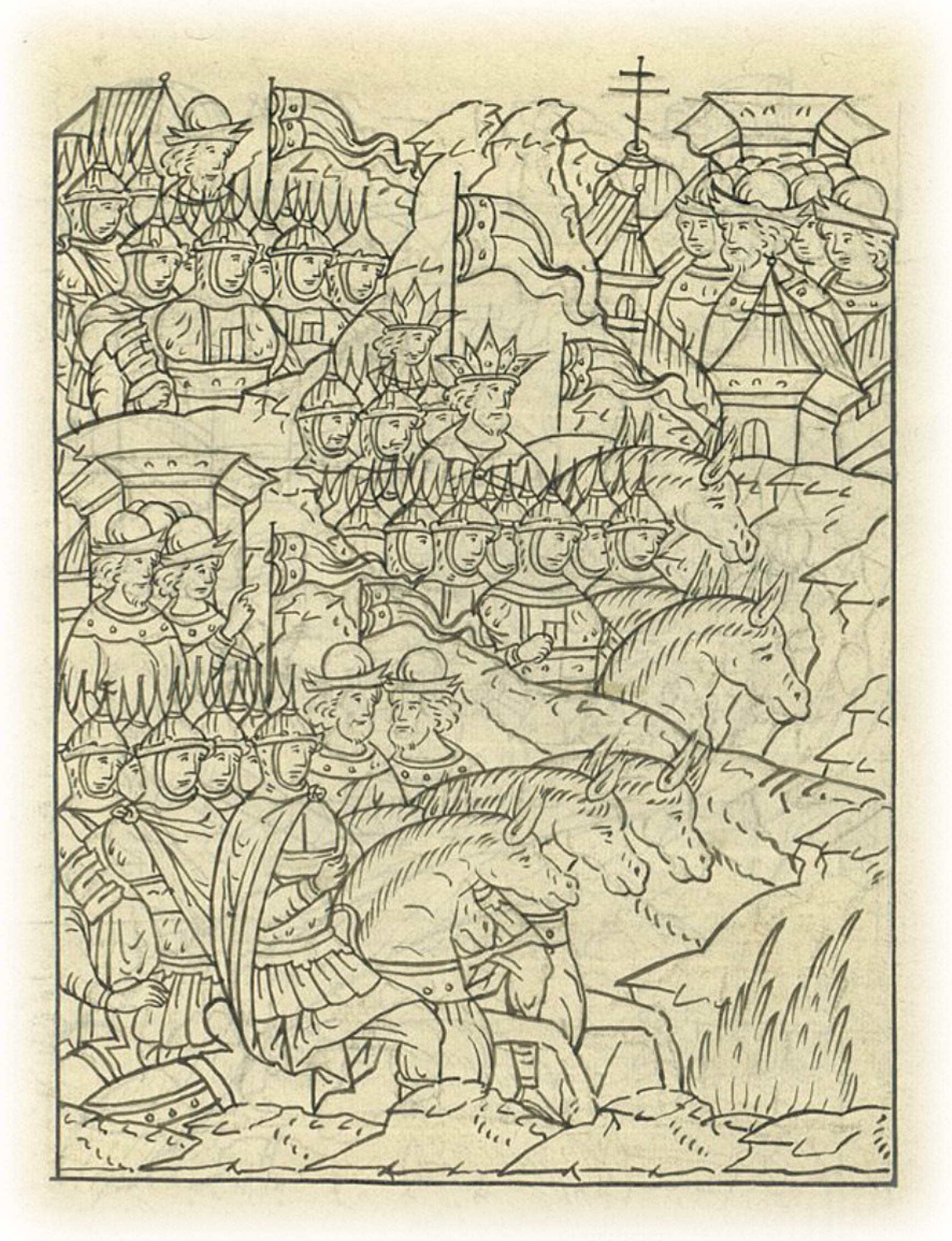 Языки говорят воеводам царя Ивана Васильевича, что магистр окопался большим рвом вокруг города Рындола, бьет из пушек и пищалей и приступает к Рындолу.