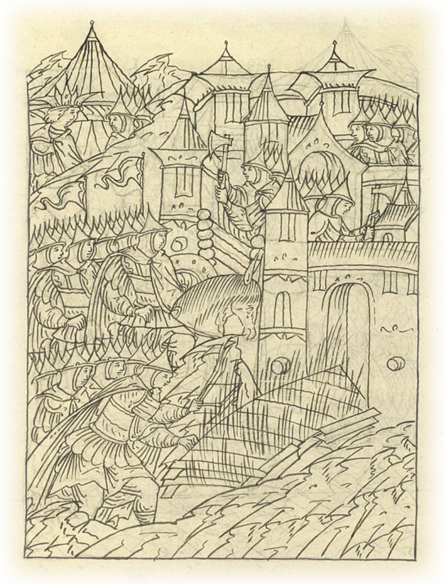 Языки говорят воеводам царя Ивана Васильевича, что магистр окопался большим рвом вокруг города Рындола, бьет из пушек и пищалей и приступает к Рындолу.
