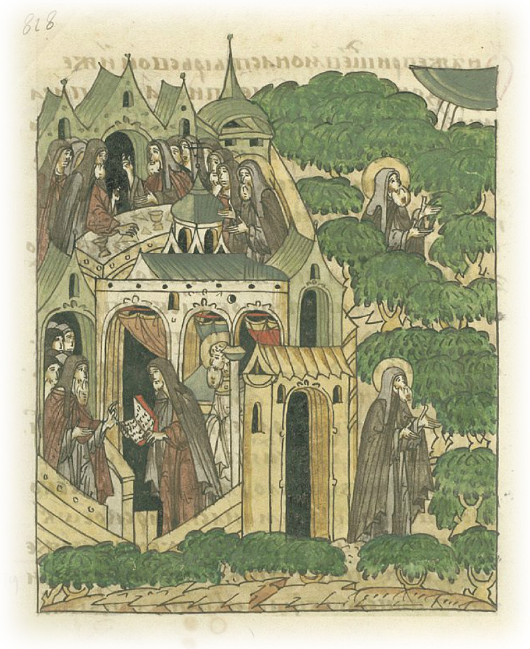 Повесть о преподобном Сергии Радонежском. Старший брат Сергия Стефан начинает говорить, что он первым пришел в пустынное место и воздвиг церковь, потому он должен быть игуменом.