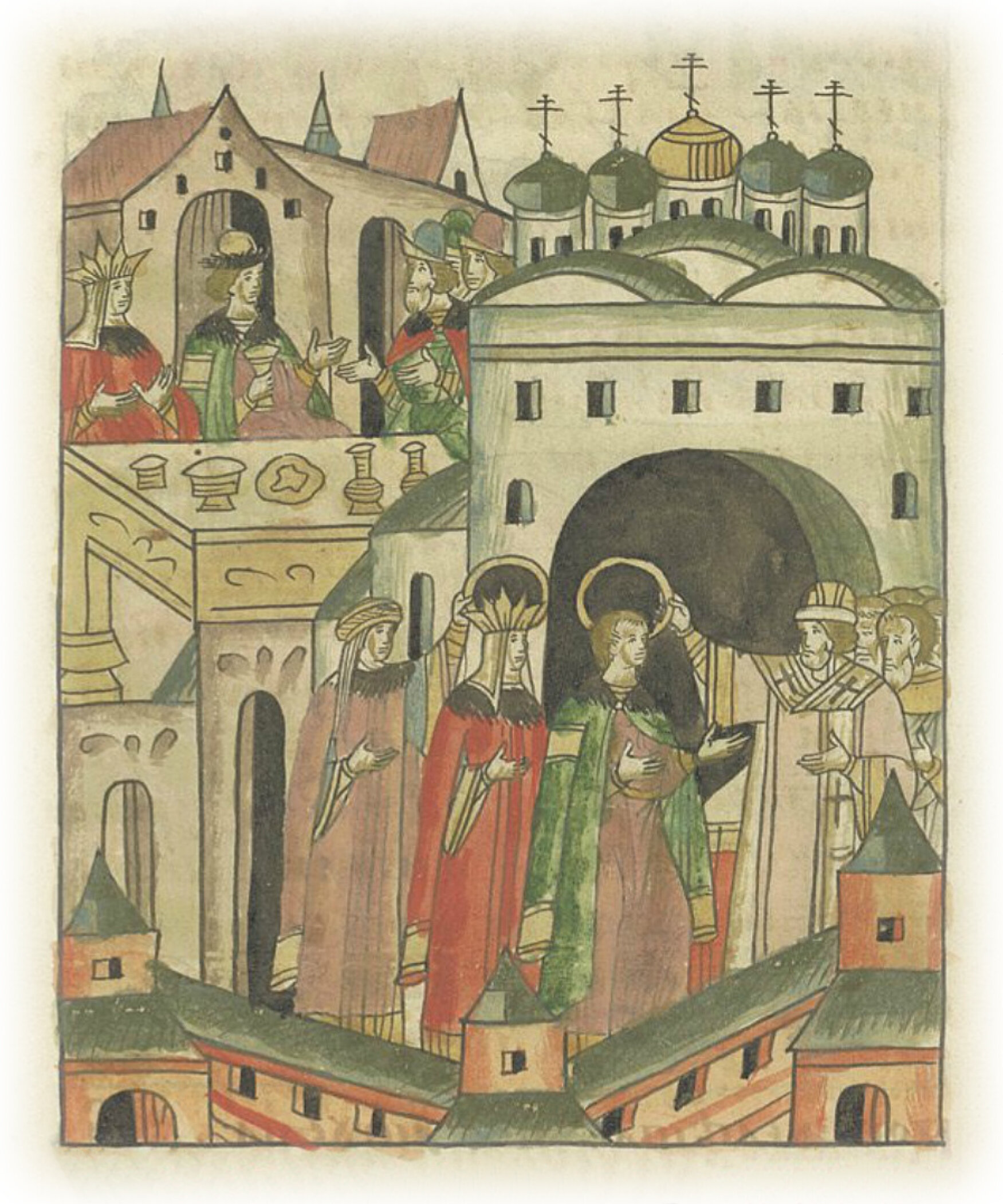 О свадьбе князя Андрея Васильевича Угличского. Той же весной (месяца) мая в 27 день, в неделю Слепого, женился князь Андрей Василиевич Угличский на Москве, взял княжну Елену, дочь князя Романа Мезецкого; а венчал их в (церкви) пречистой (Богородицы) Филипп митрополит.