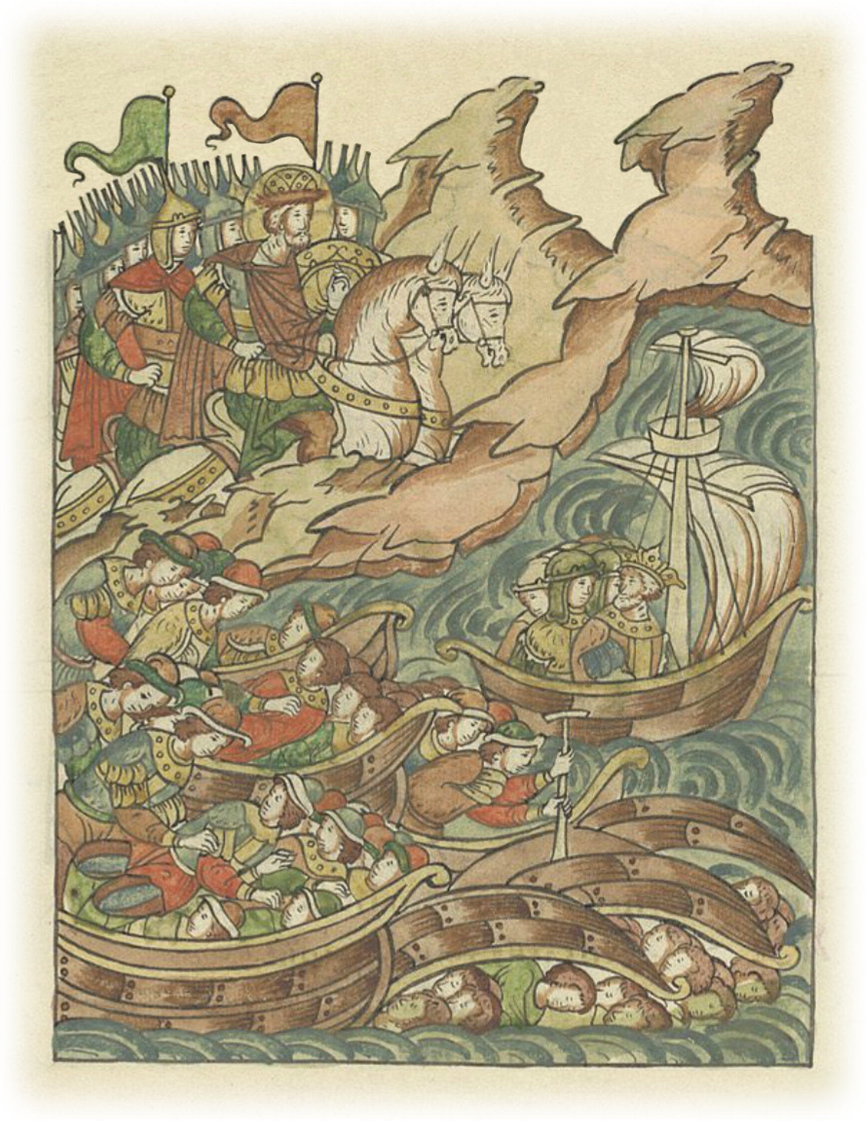 Победа князя Александра Ярославича над римлянами. Противники бегут с поля боя и топят трупы своих воевод в Неве.