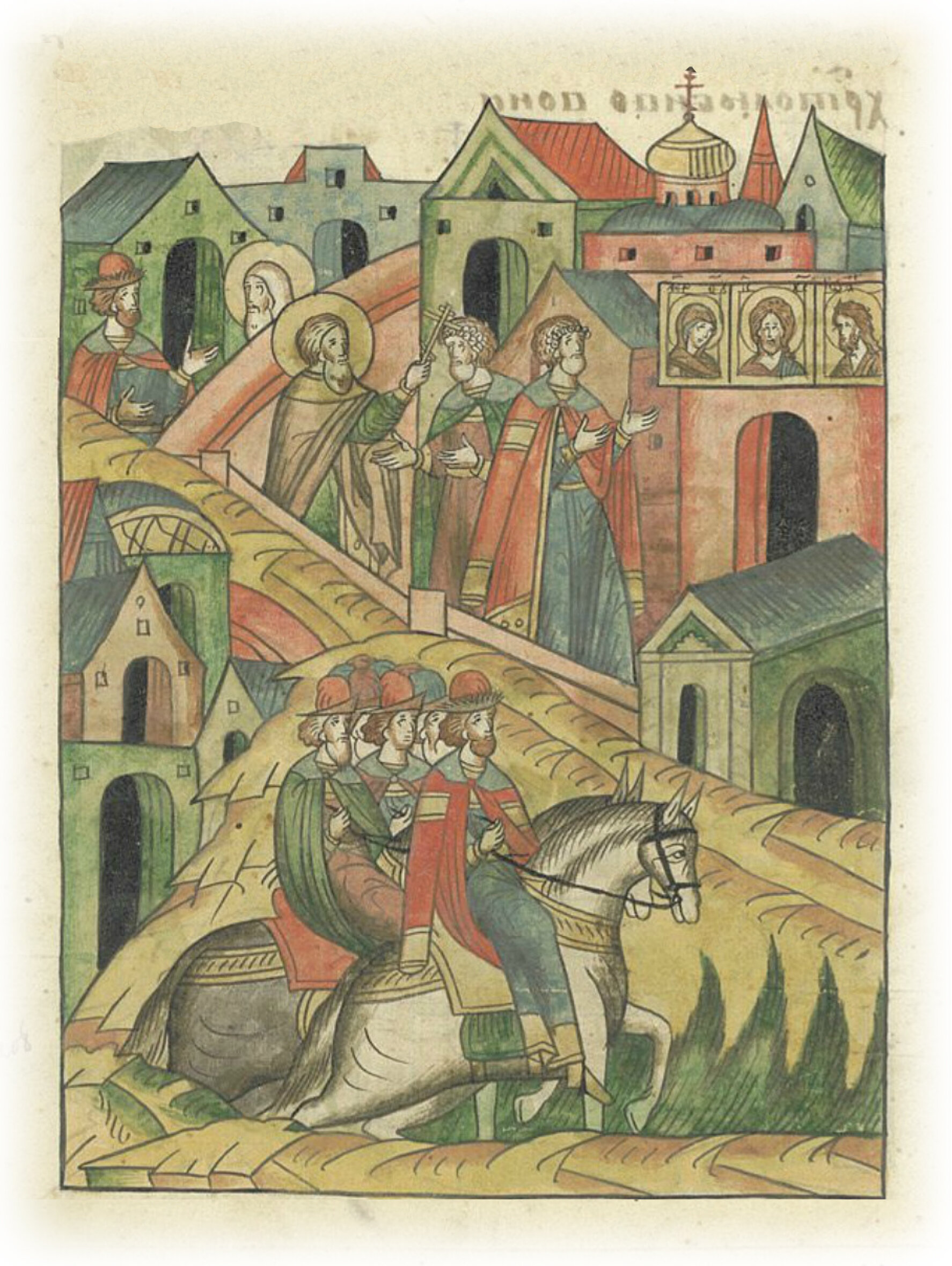Великий князь Дмитрий Иванович приходит в монастырь Живоначальной Троицы в Радонеж к преподобному игумену Сергию, благословляется у него и благодарит за помощь.