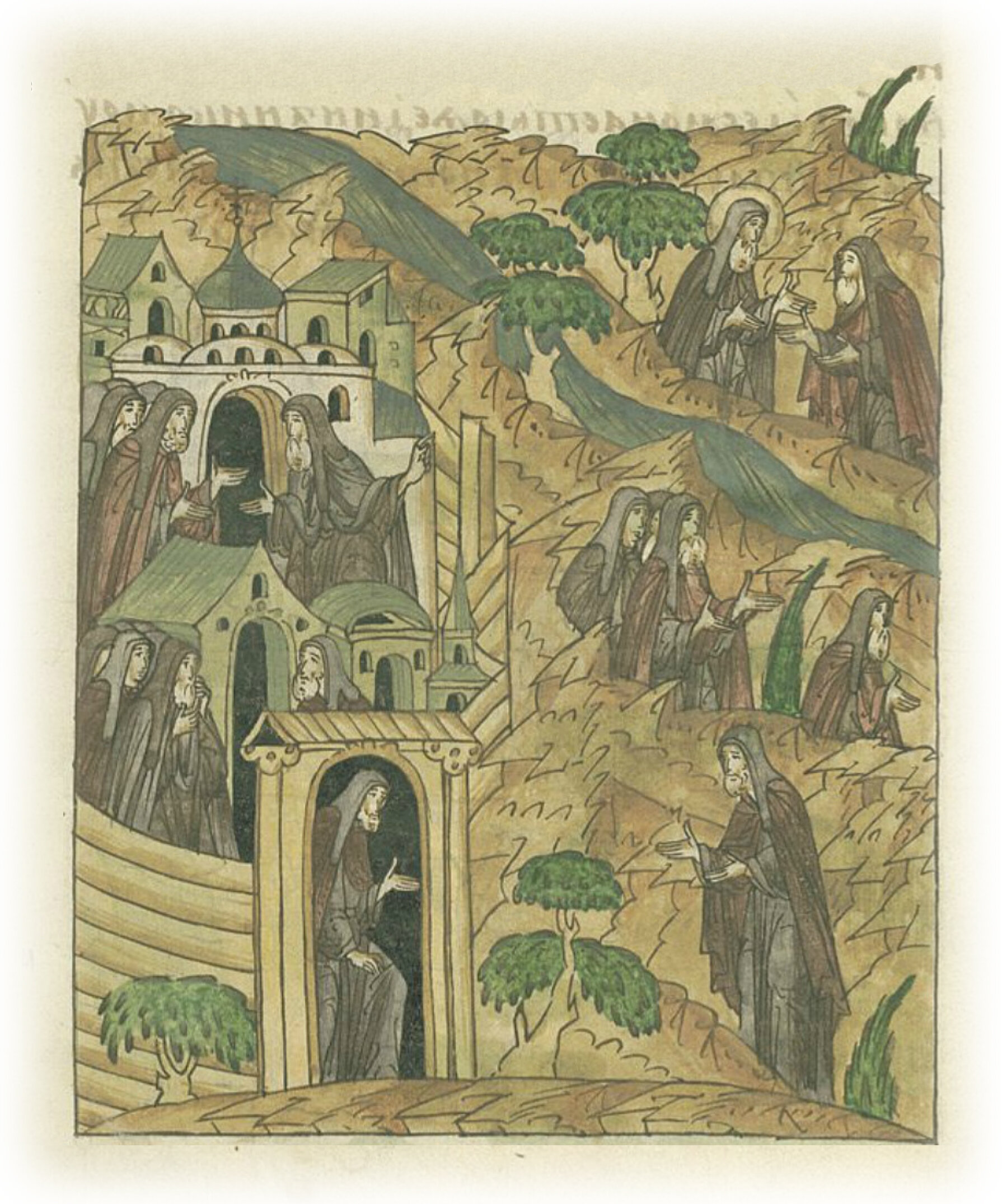 Повесть о преподобном Сергии Радонежском. Братья беспокоятся о пропаже игумена Сергия и идут его искать. Один брат находит его на Кержаче. Братья, обрадовавшись, начинают приходить к Сергию.
