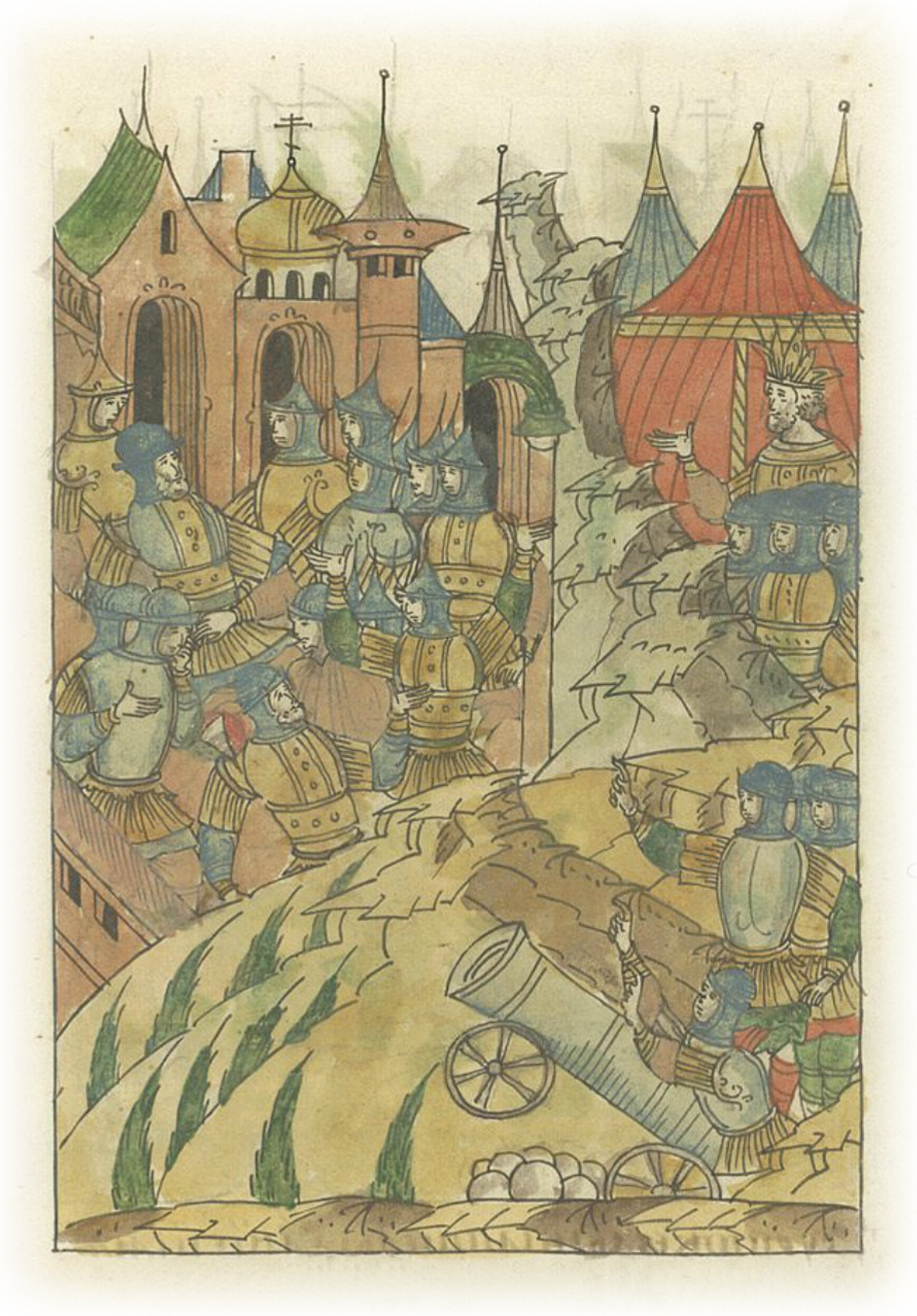 прилетело ядро, ударило Зустунея, попало ему в правое плечо, и пал он на землю, словно мертвый. И склонились над ним бояре его и все люди, крича и рыдая, (взяли) и понесли его прочь; также и фряги все пошли за ним.
