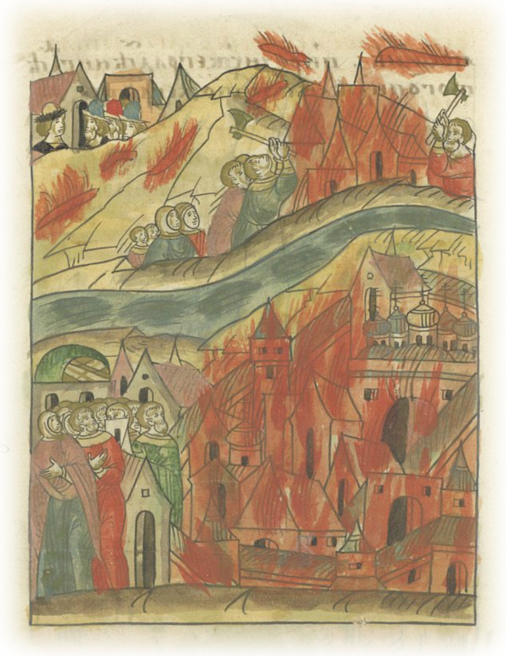 В том же году (месяца) августа в 30 день, в конце второго часа от Богданова двора Носова загорелась Москва внутри города на Подоле, близ церкви Константина и Елены; и до вечерни выгорел весь (Подол). Тогда с полуночи начался сильный ветер, и за рекой многие дворы погорели, а иные отстояли. А головни и бересту с огнем очень далеко, за много верст носило. А великий князь был тогда на Коломне. Остался в городе двор князя Ивана Юрьевича, да племянников его два двора, да Орины Алексеевой: ибо оттуда ветер тянул.