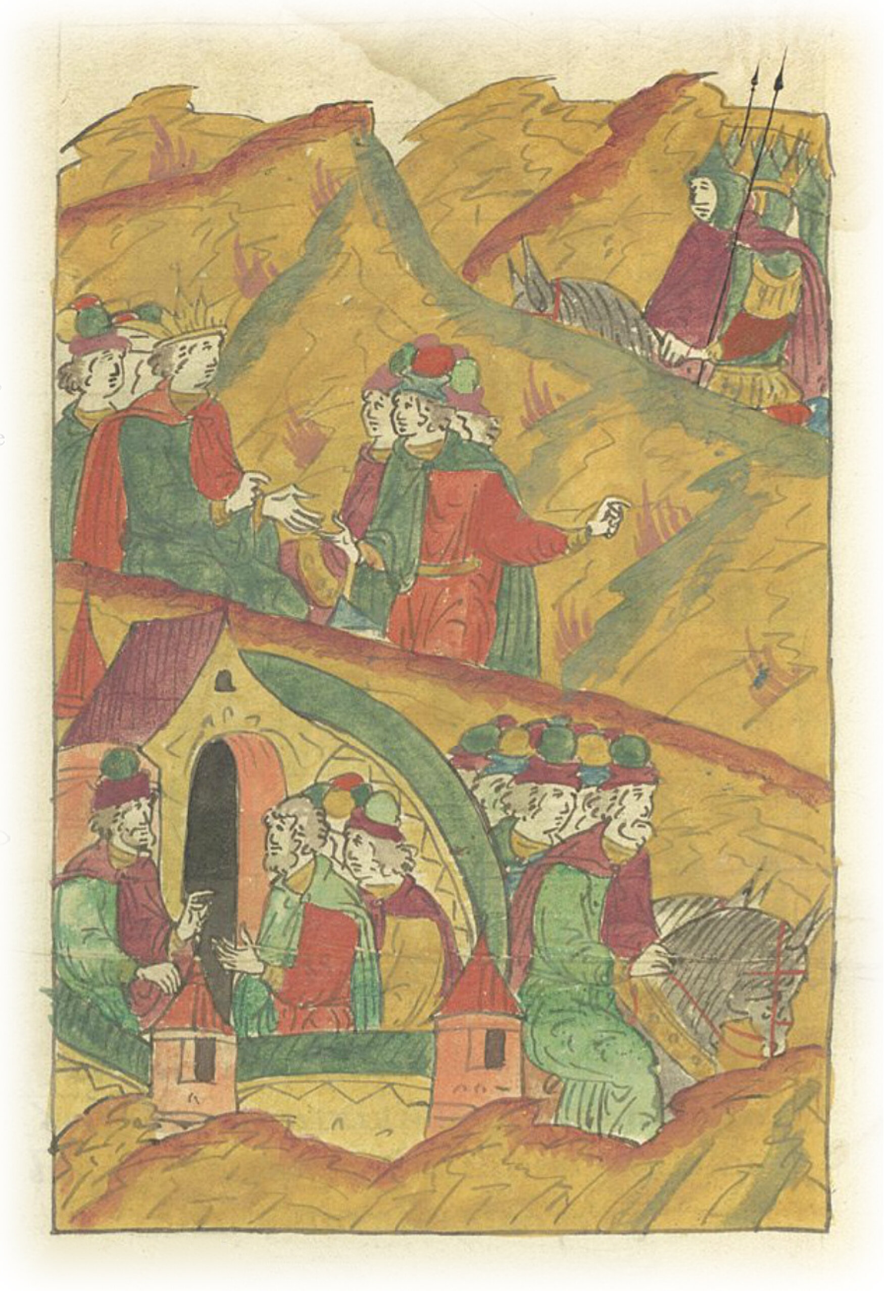 И Федор послал Гаврила толмача, и Гаврило приехал с Поля, сказал великому князю, что наехал на Поле на следы большого войска: шли многие люди к Руси, тысяч со сто и более.