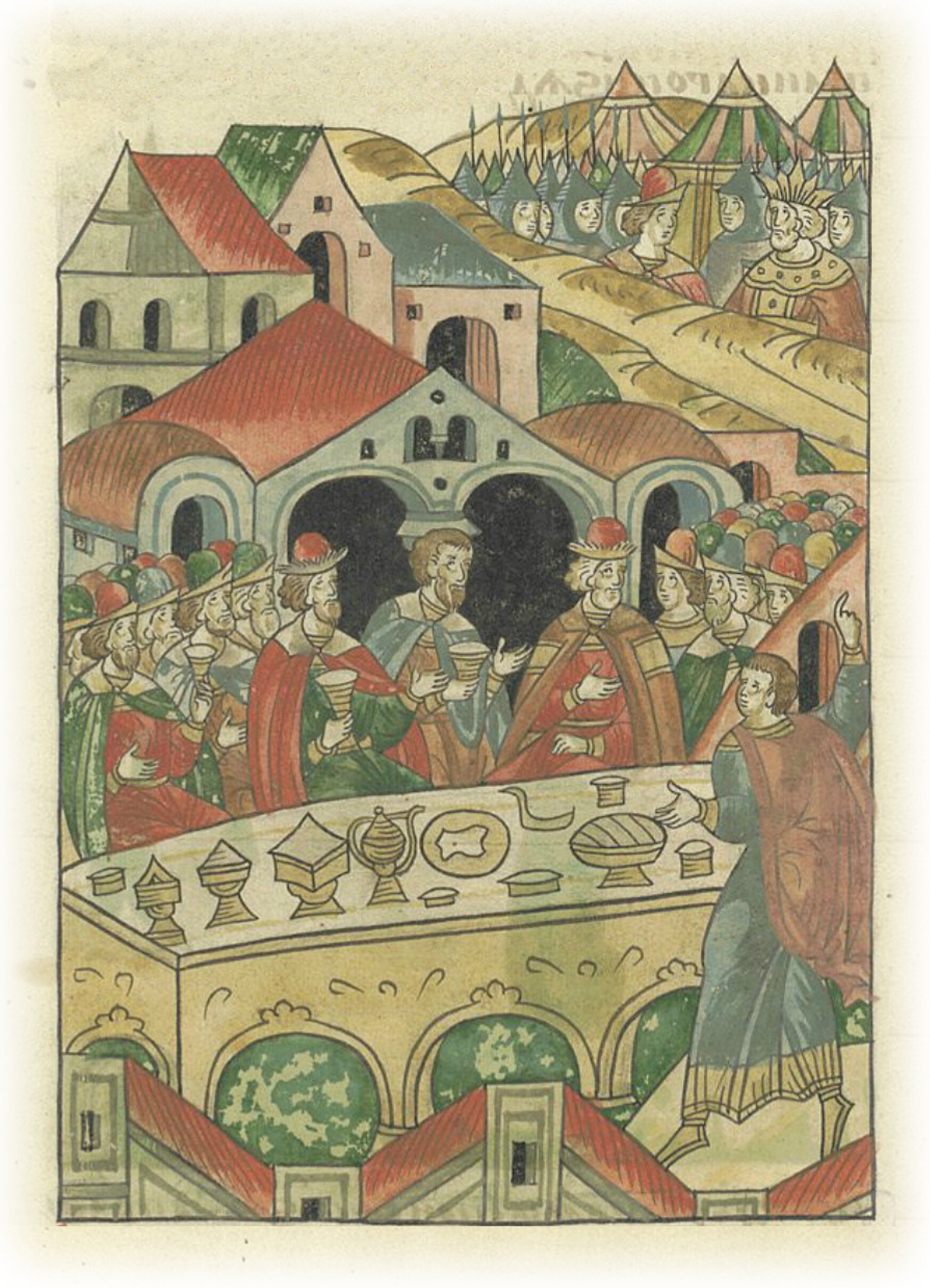 И когда великий князь был на пиру у Микулы Васильевича, тысяцкого, с братом своим, с князем Владимиром Андреевичем, и со всеми тогда пришедшими князьями и воеводами, и тут вновь начали появляться вести, что Мамай неотложно хочет идти на великого князя Дмитрия Ивановича.