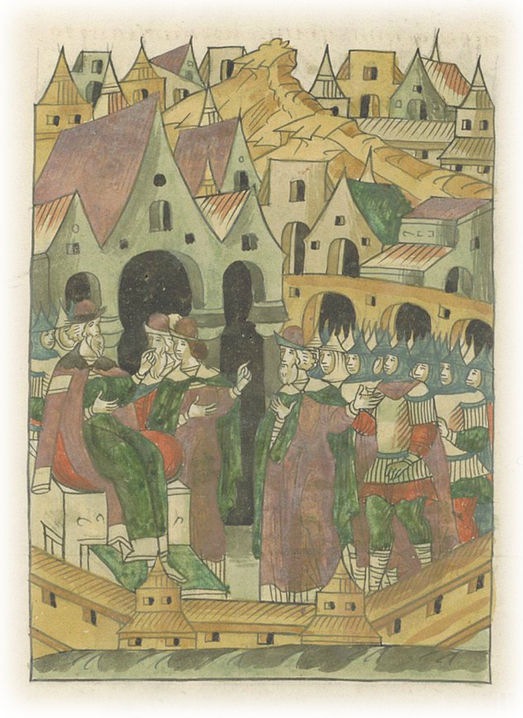 Ругодивские посадники Яким и Захар приезжают в Москву. Воеводы царя Ивана Васильевича Алексей Адашев и Иван Михайлов сообщают им, что государь пожалует их, если сдадут его воеводам помимо Ругодива Вышгород.