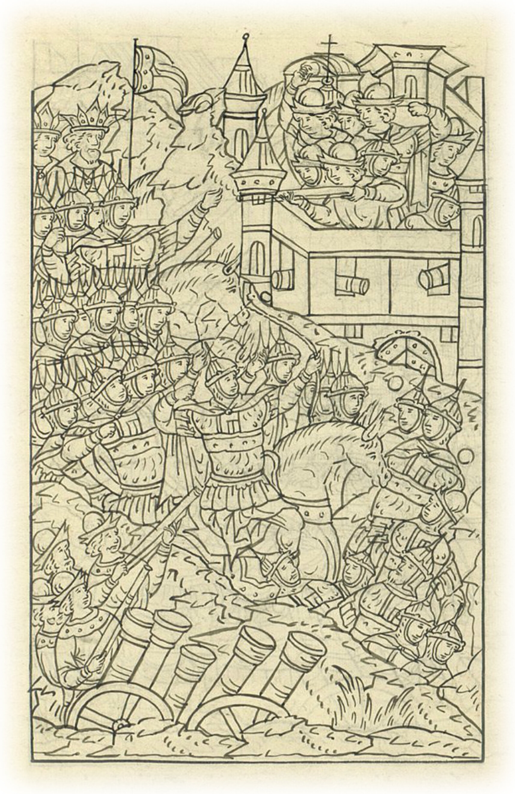 Татары приступают к Пронску, бьют по городу из пушек и пищалей и сражаются с горожанами.