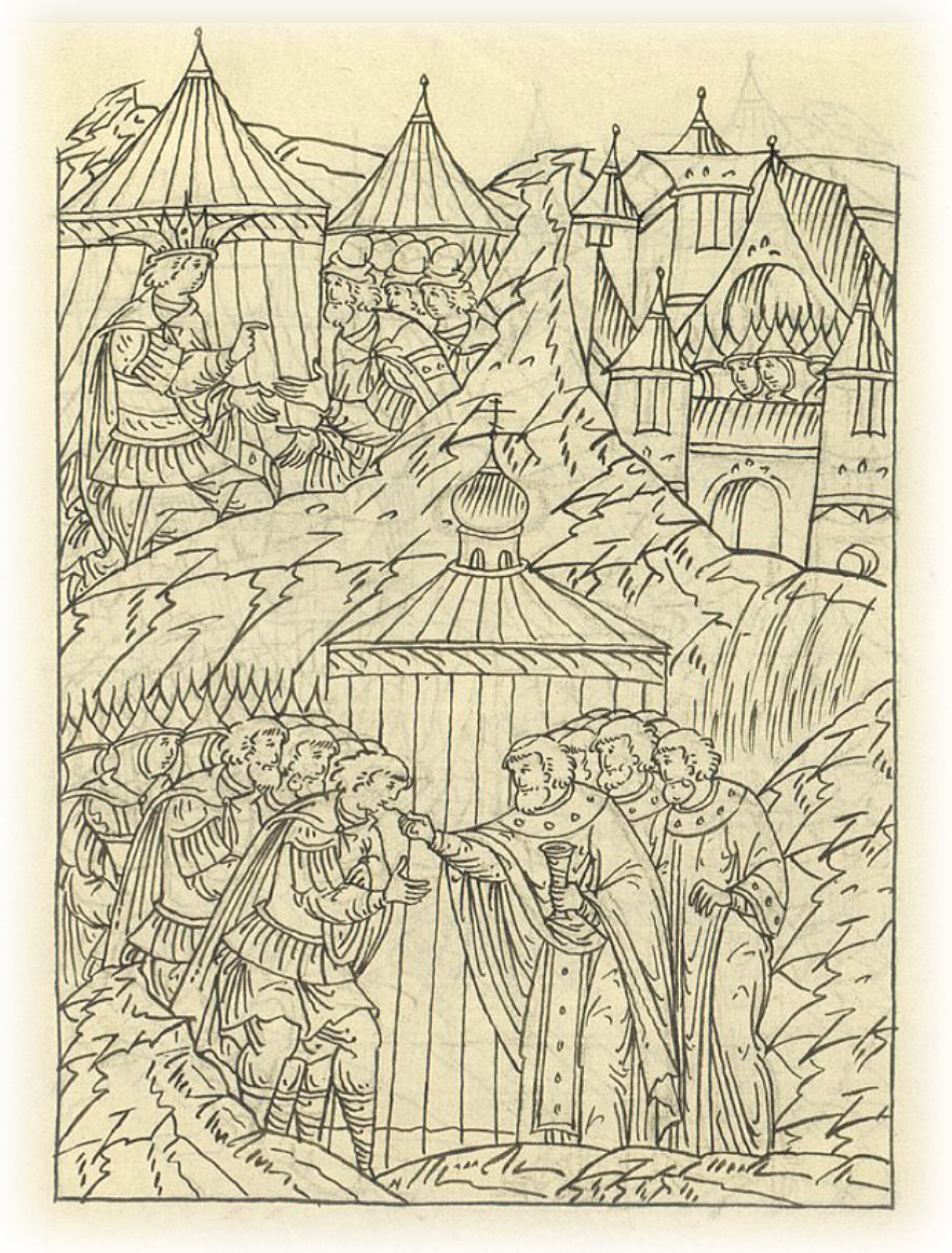 О приготовлении к очищению. Царь же благочестивый повелел во всех полках приготовиться к приступу в воскресенье, и очистились все, и у отцов своих духовных исповедались, достойной благодати сподобясь, ибо приближался день, в который предстояло испить общую чашу всем.