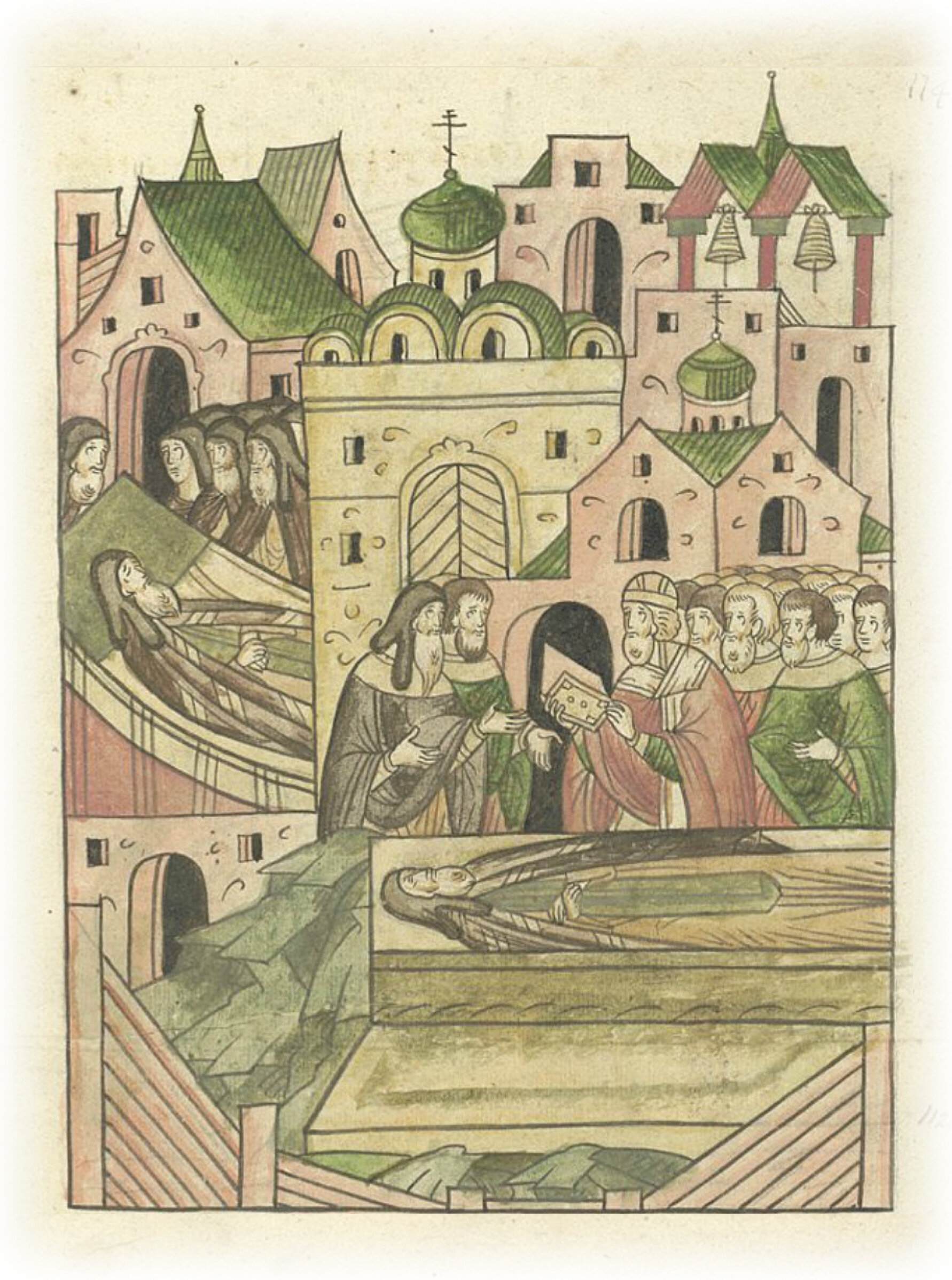 Кончина Тверского владыки Феодора и его похороны в церкви Введения Пречистой Богородицы.