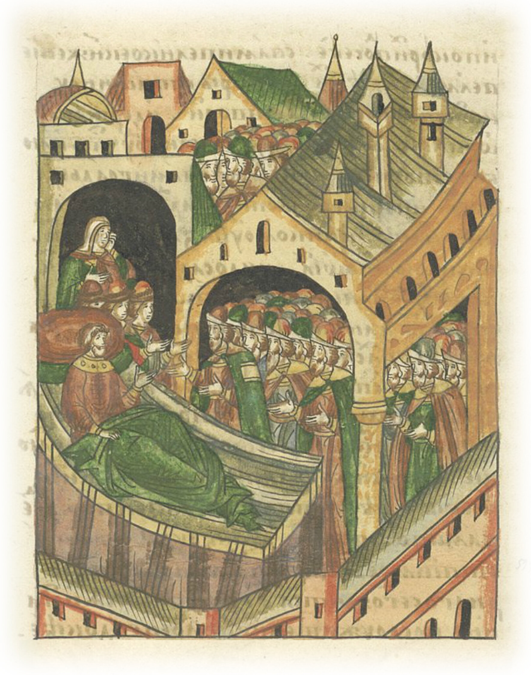 И к боярам своим обратился, сказав: «Подойдите ко мне, и я расскажу вам, что сделал я за жизнь свою. Вы, ведь, знаете обычаи и нрав мой: при вас я родился и вырос, и с вами вместе царствовал, и отчиной своей, великим княжеством, правил 27 лет, а от рождения мне 40 лет. С вами вместе ходил в походы, с вами в битвах был страшен, и с Божьей помощью низложил врагов своих, и покорил себе, с вами великое княжение укрепил, мир, и спокойствие в княжестве своем установил. Державу отчины своей сберег, великую честь и любовь имею к вам и вместе с вами управлял городами, волостями. Детей ваших любил и никому из вас не сделал зла, насильно ничего не отбирал, не досаждал, никого не укорял, не грабил, не бесчинствовал, но всех почитал и любил, и в чести великой держал, радовался и горевал вместе с вами. Вы же назывались у меня не боярами, но князьями земли моей. Ныне же вспомните слова, которые вы говорили мне: «Господин княже, должны мы, служа тебе и детям твоим, за вас головы положить». Теперь, после ухода моего от сего кратковременного и бедного жития, истинно послужите княгине моей и чадам моим от всего сердца своего. В радости повеселитесь с ними, а в горе не оставьте их. Пусть сменится скорбь ваша радостью. Да пребудьте в мире».