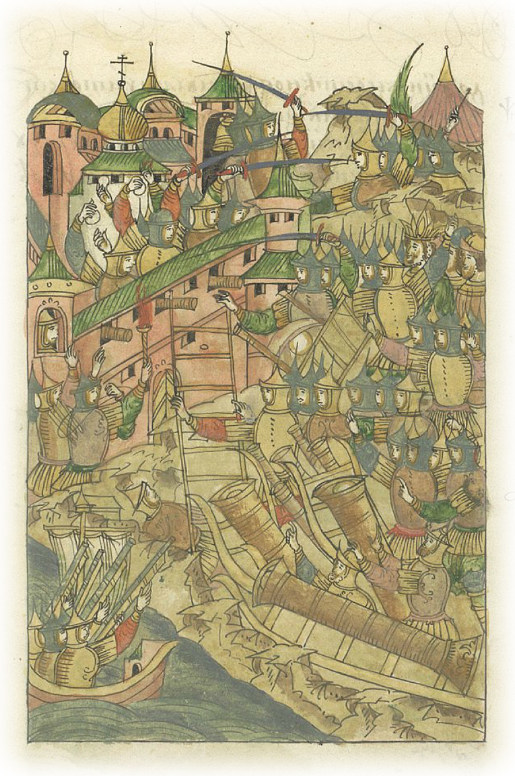 Когда же безбожные турки всех людей со стен сбили, по всем сторонам вскричало все воинство, и разом со всех сторон напали на город, крича и вопя: одни с различными огнями, а другие с лестницами, иные же со стенобитными приспособлениями и многими кознями, (приготовленными) для взятия города. Городские же люди с криками и воплями бились с ними крепко.