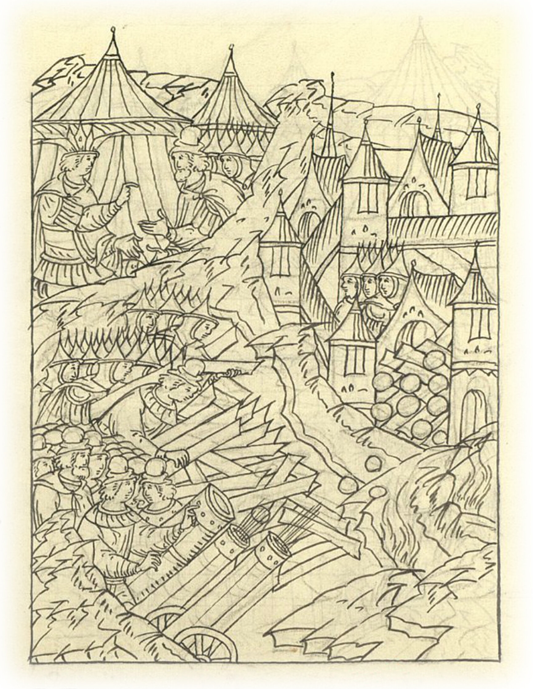 Языки говорят воеводам царя Ивана Васильевича, что магистр окопался большим рвом вокруг города Рындола, бьет из пушек и пищалей и приступает к Рындолу.