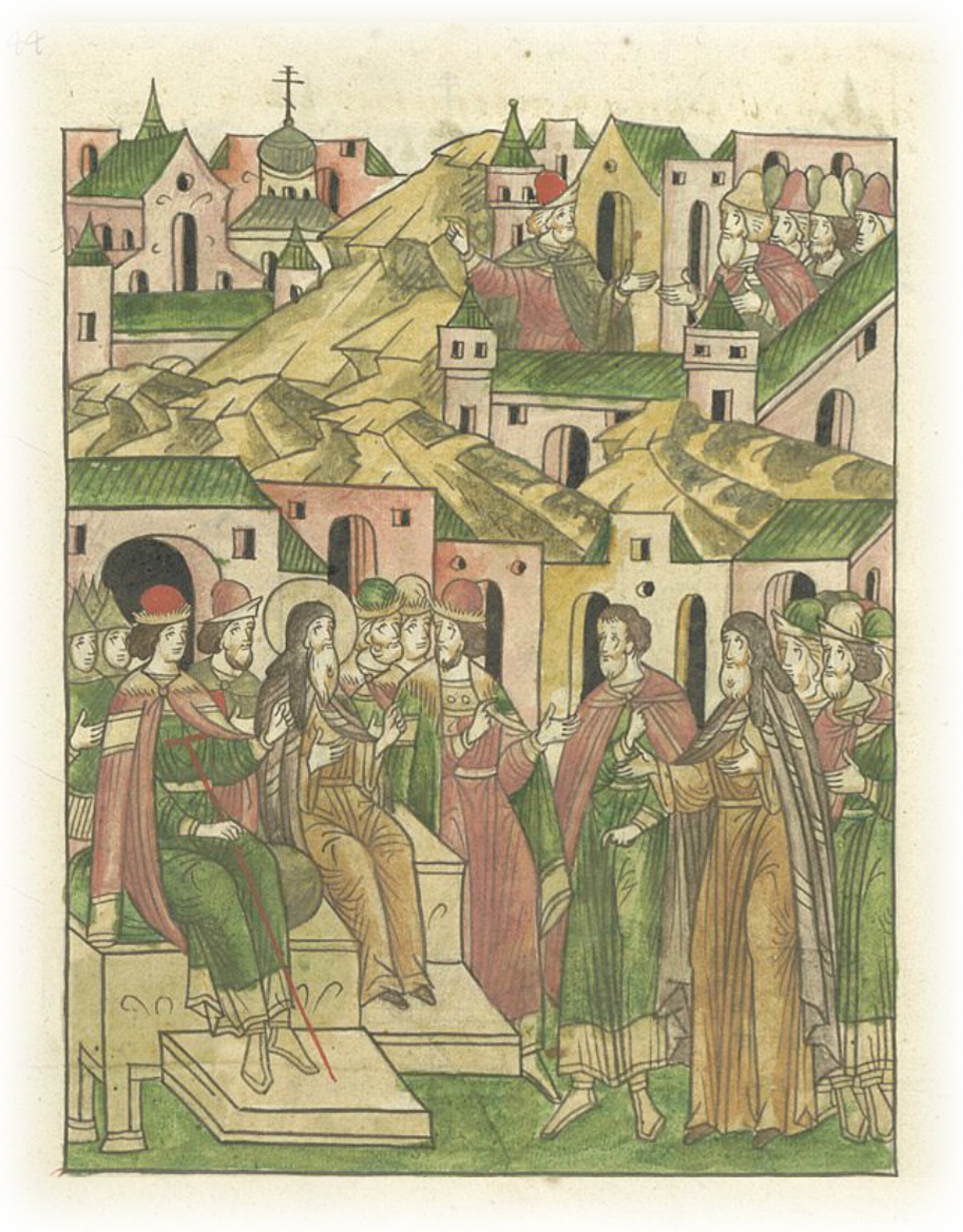 Владыка Василий судит перед митрополитом в Москве князей Василия Михайловича с сыном князем Михаилом и князем Еремеем в их распре об уделе князя Семена.