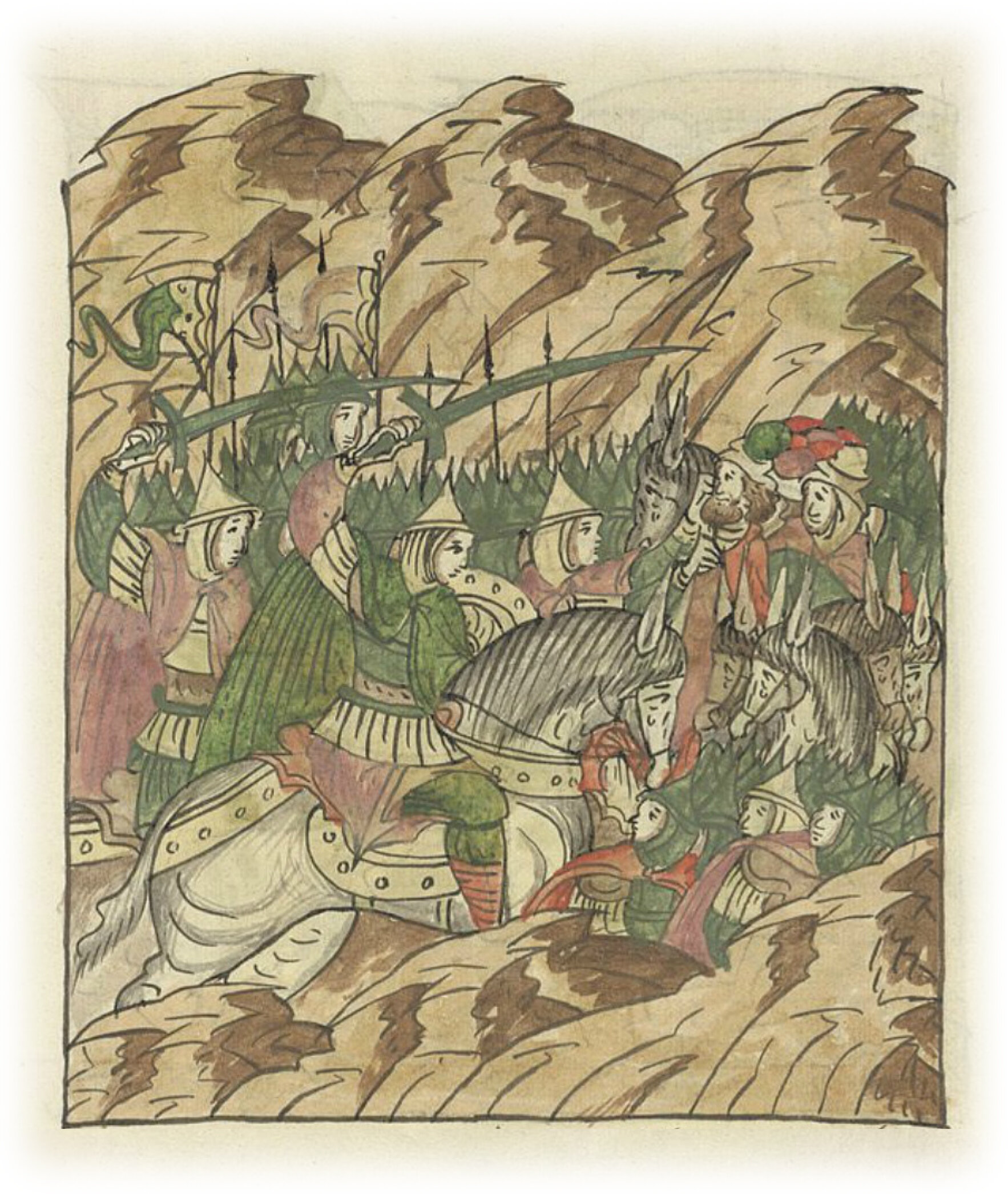 Новогородцы же узнали о лукавстве их и наехали, не оповещая, на станы их; они же побежали к городу своему. Новгородцы убили у них двух воевод, а третьего в плен взяли и отняли семьсот коней.