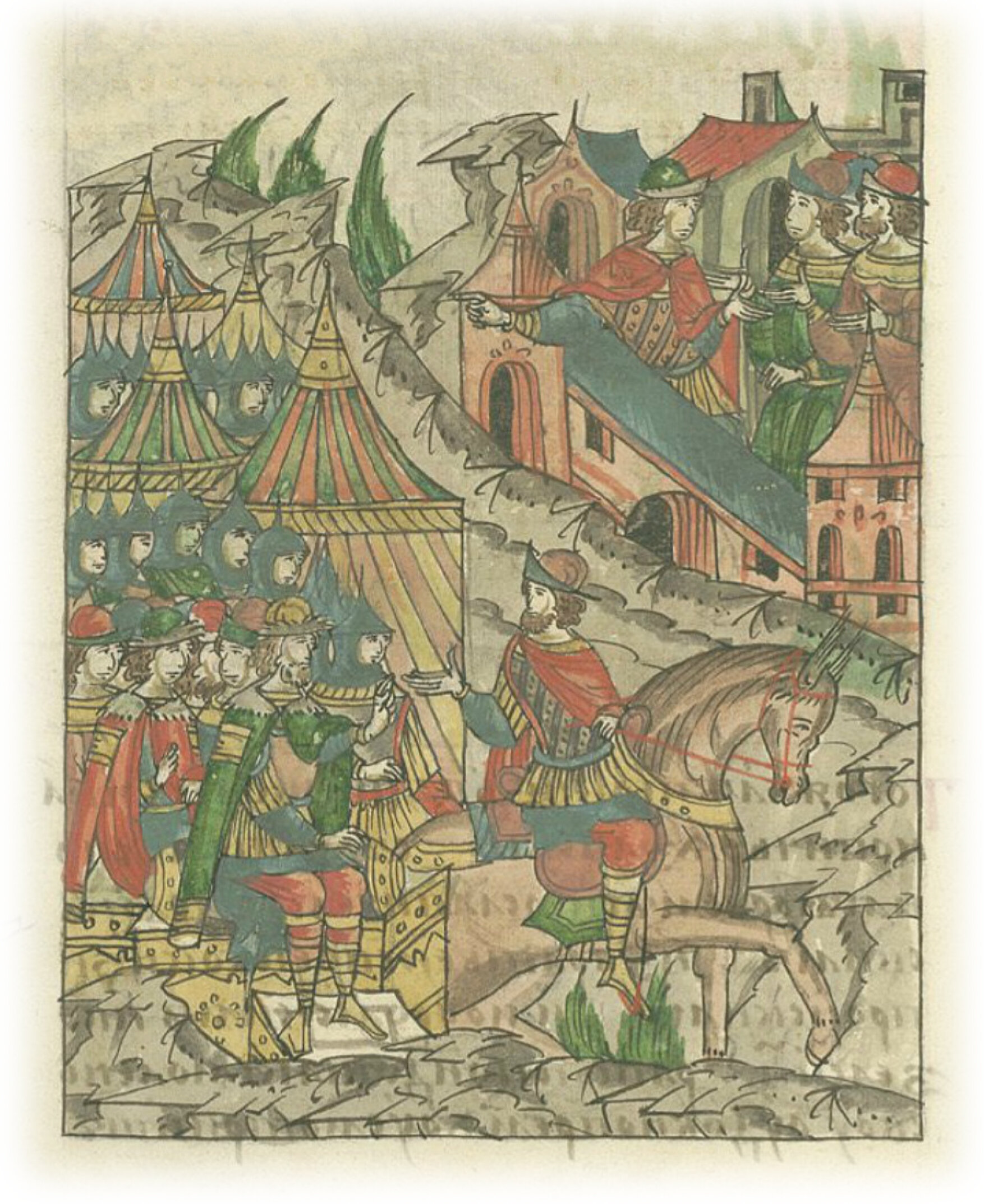 И, когда они подошли к Смоленску, послал в город великий князь Олег Иванович посла, говоря: «Если вы не откроете городских ворот и не примите вашего господина великого князя Юрия Святославича Смоленского на его отчину, на великое княжение Смоленское, то будем долго стоять под стенами города, а всех вас предадим мечу и огню. Решите сами, что вы выбираете, смерть или жизнь».