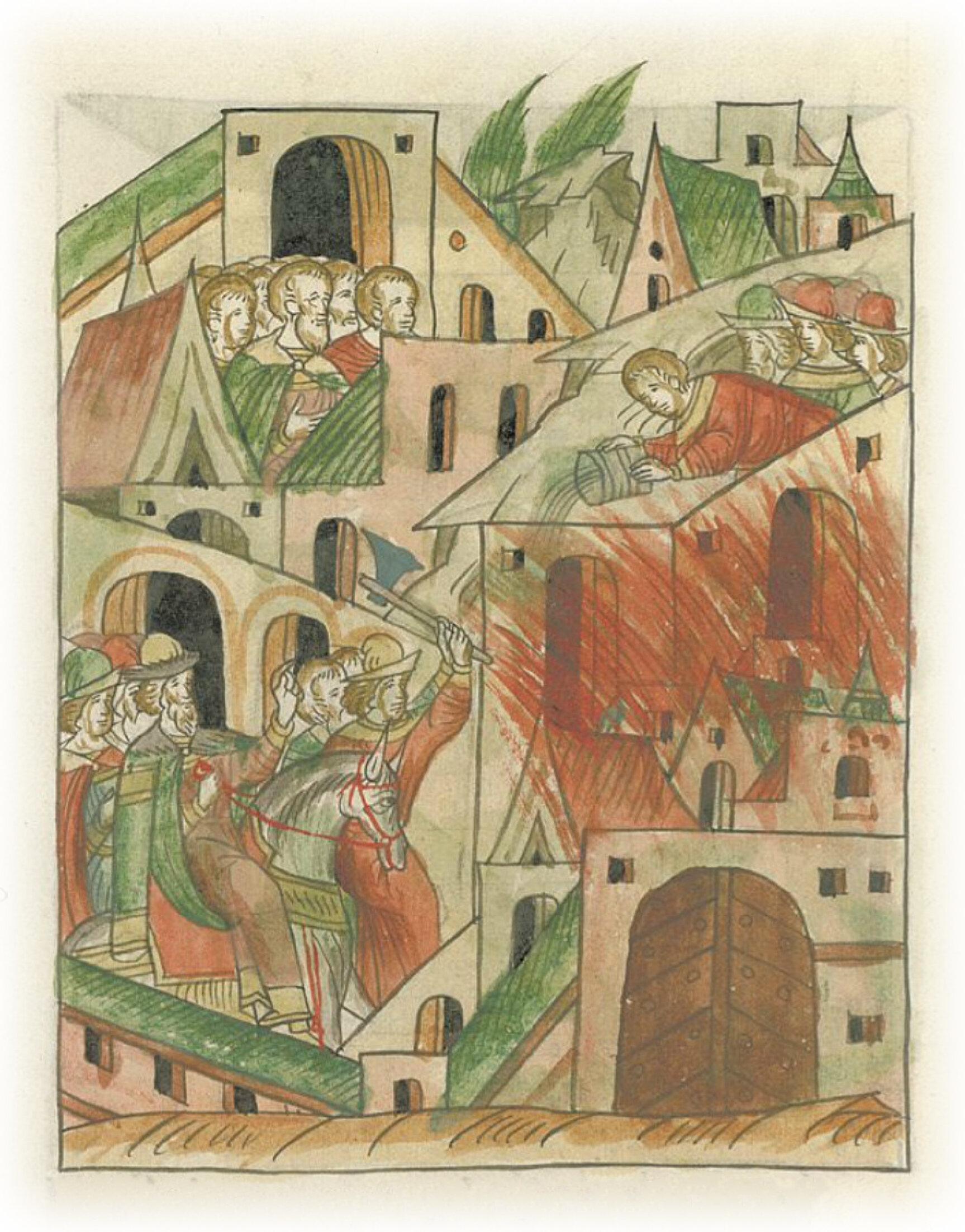 Пожар в Мокве близ Тимофеевских ворот, погашенный великим князем Иваном Васильевичем.