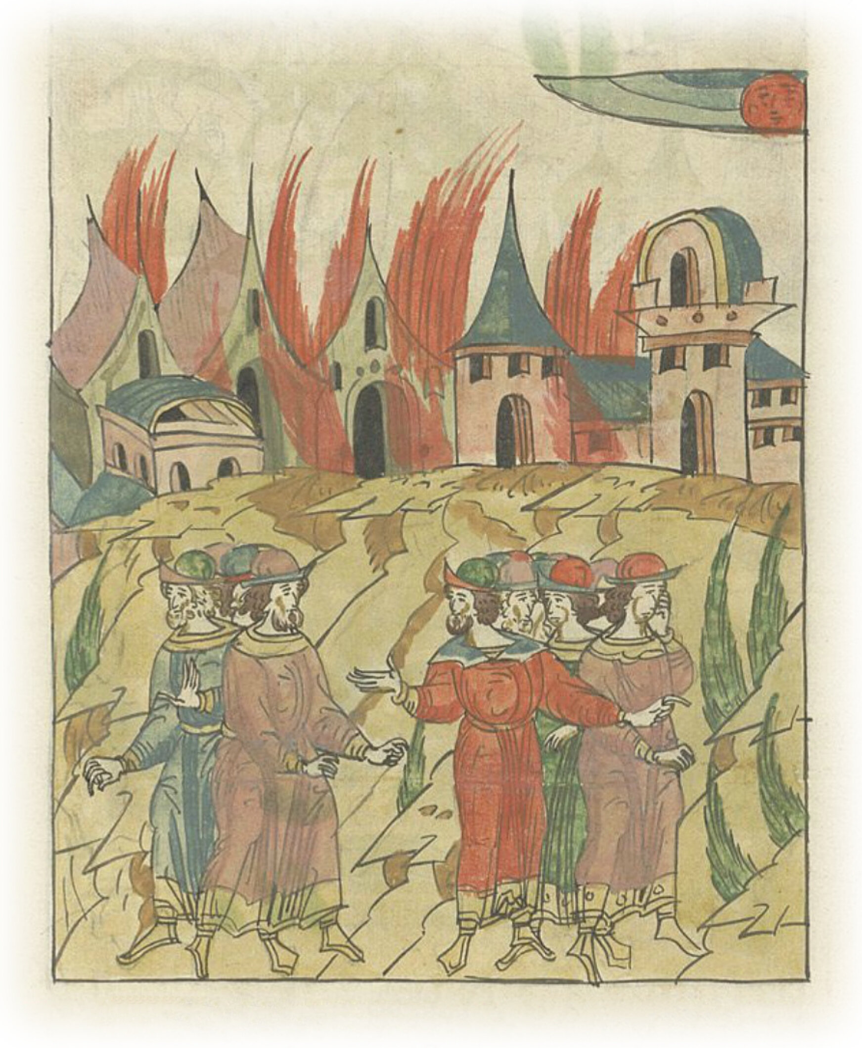 В ту же весну в Вербную субботу сгорела Коломна, немного осталось от него; загорелся город в вечерню, а к заходу солнца пожар прекратился, и начали люди ходить по пожарищу.