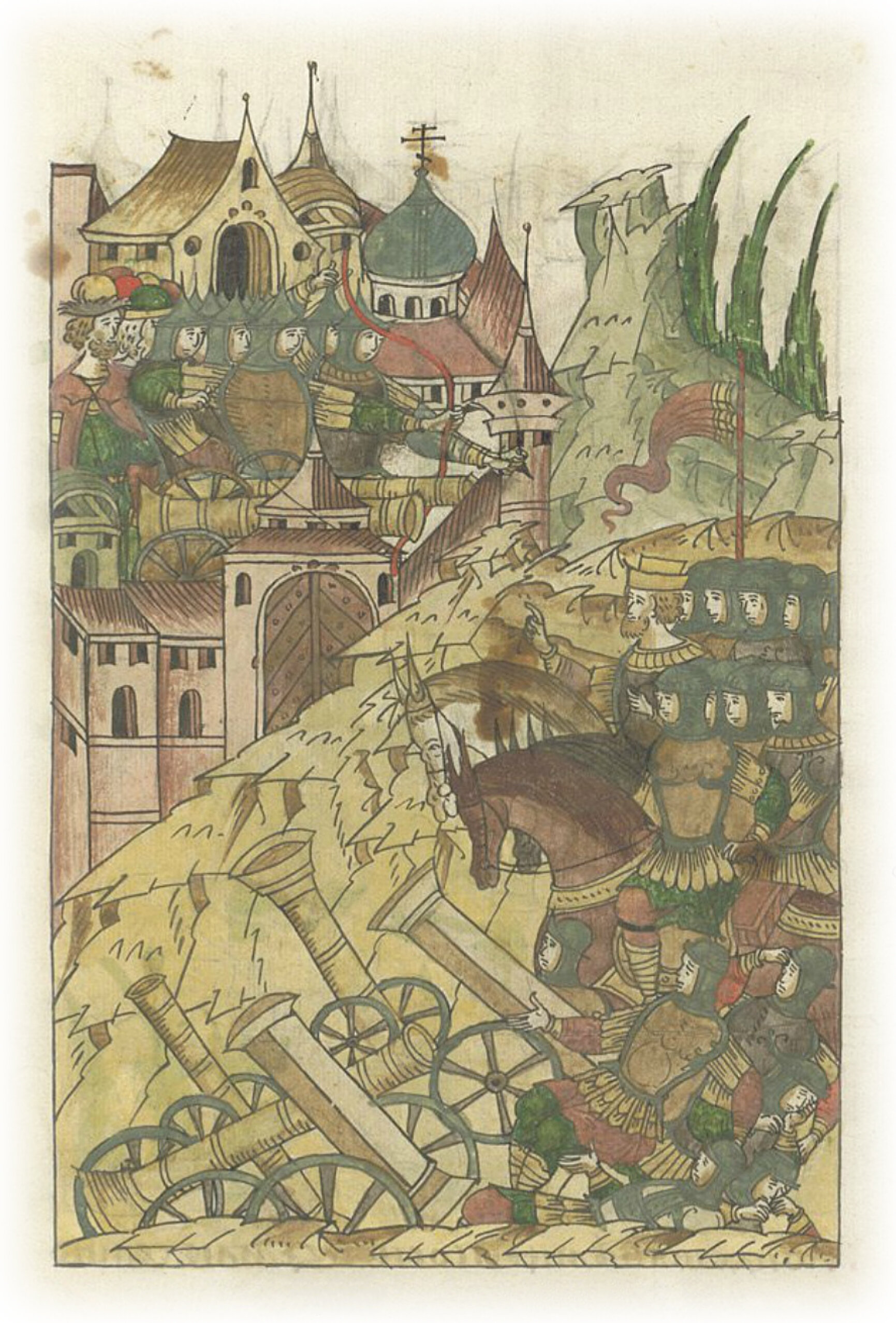 Языки говорят воеводам царя Ивана Васильевича, что магистр окопался большим рвом вокруг города Рындола, бьет из пушек и пищалей и приступает к Рындолу.
