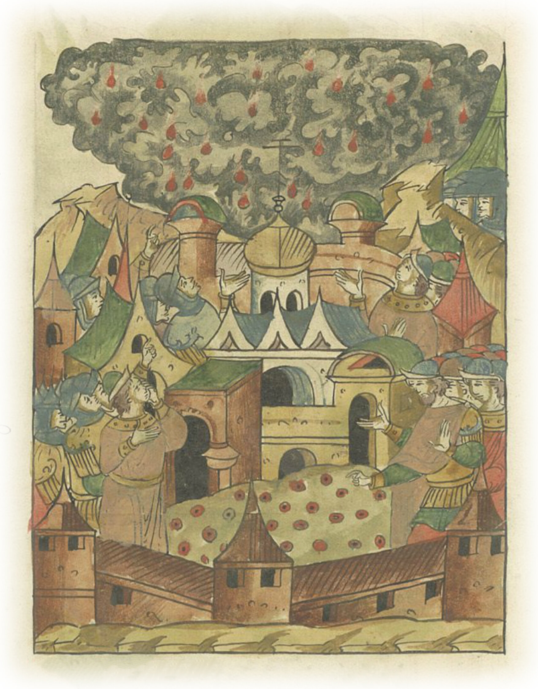 В седьмом часу ночи начала наступать на город тьма великая, воздух как бы сгустился, проявился над городом плачевным образом, испуская слезами капли огромные, красные, подобные величиной буйволиному оку, которые лежали на земле долгое время, что удивило всех людей, и они впали в великую скорбь и ужас.