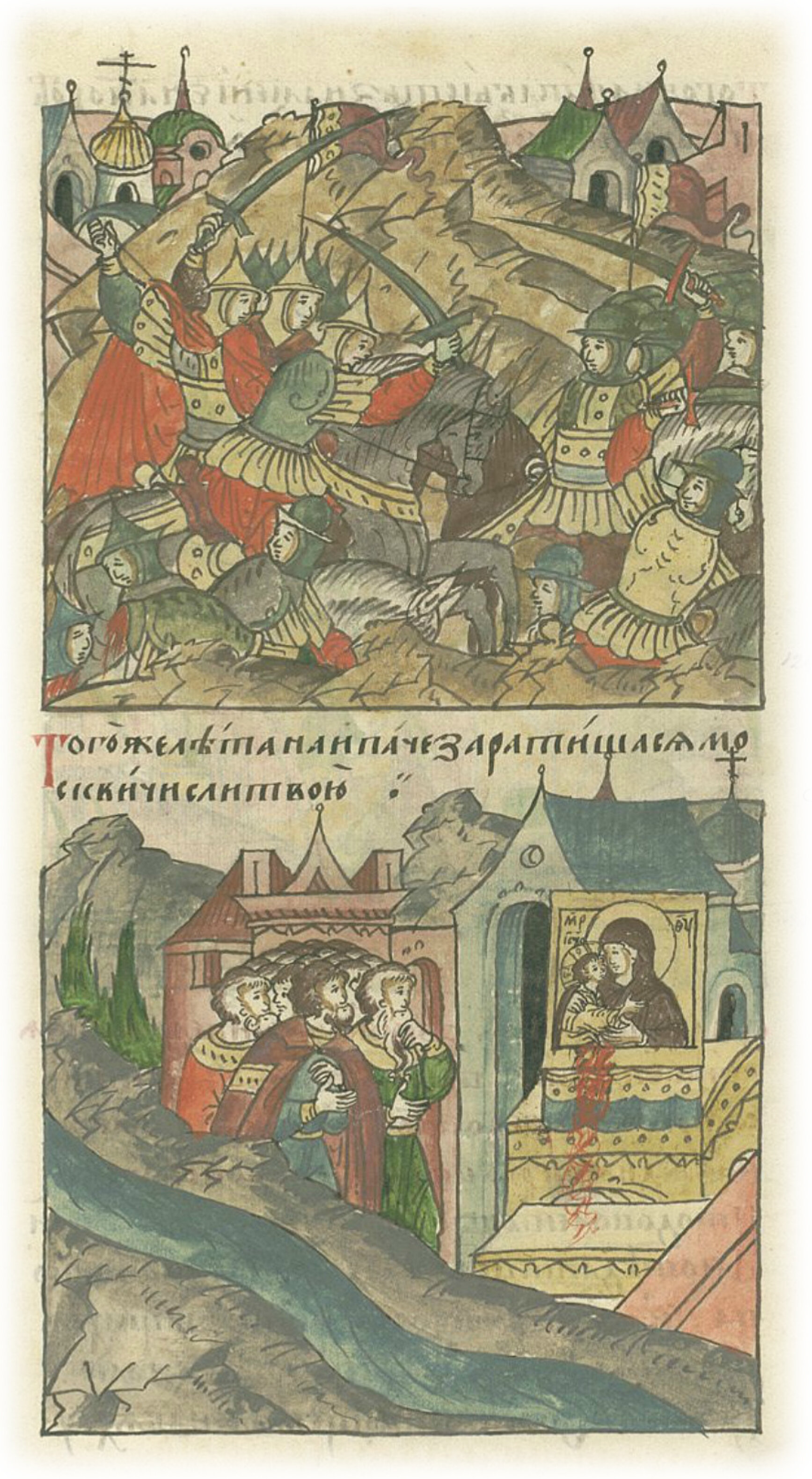 В том же году сражались москвичи с литвой. В том же году было знамение на Похре: текла кровь от иконы Пречистой Богородицы.