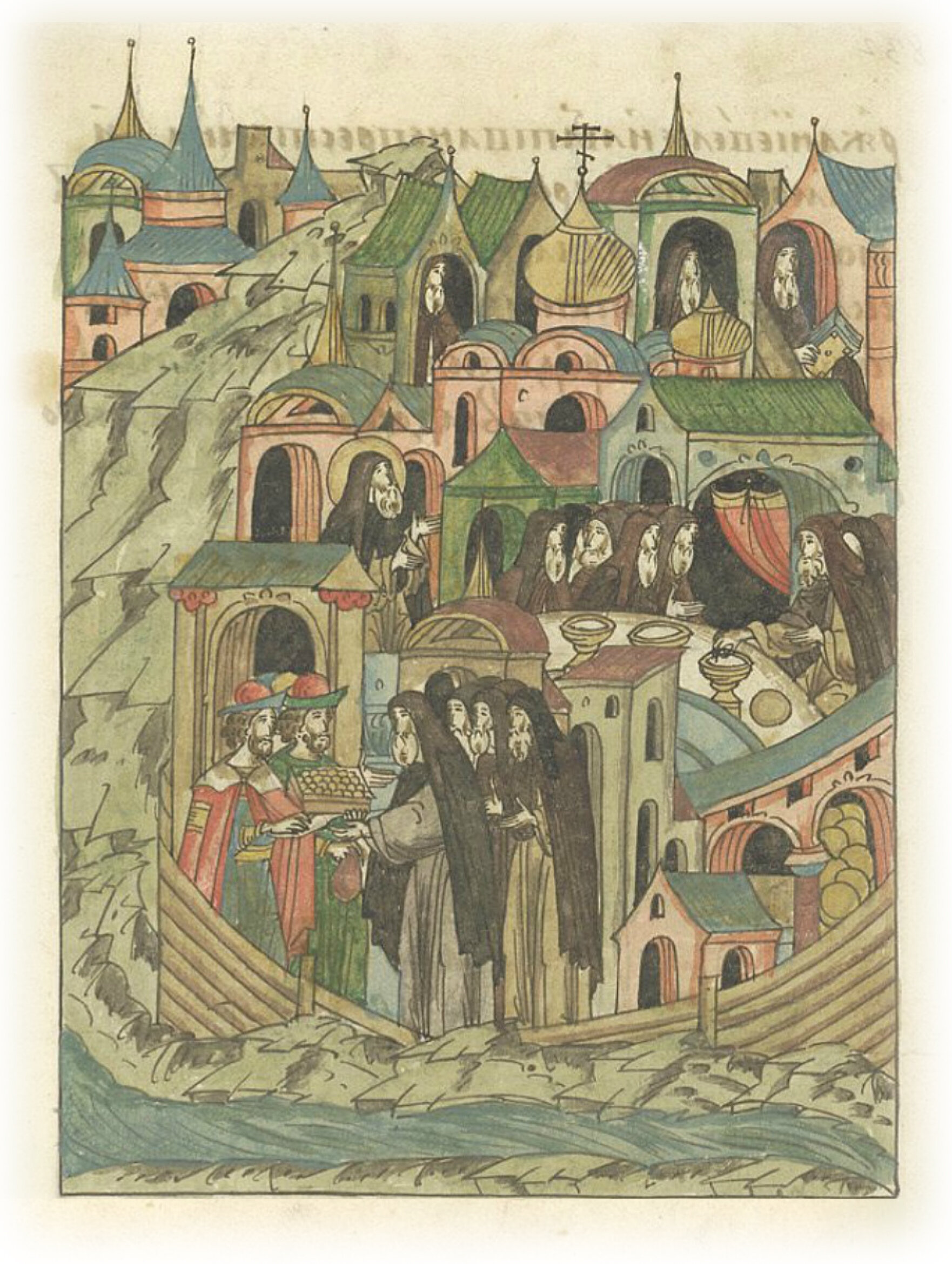 Повесть о преподобном Сергии Радонежском. Князья, бояре и вельможи дают много имения, золота и серебра для строительства монастыря в Симоново. В монастыре устанавливают общежительство.