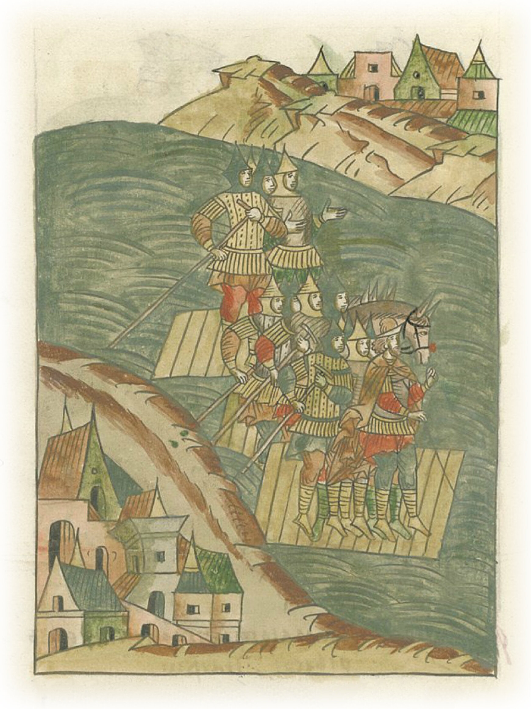 Князь Федор Пестрой приходит в Пермскую землю на устье Черной реки и оттуда на плотах с конями приплывает под город Анфаловский.
