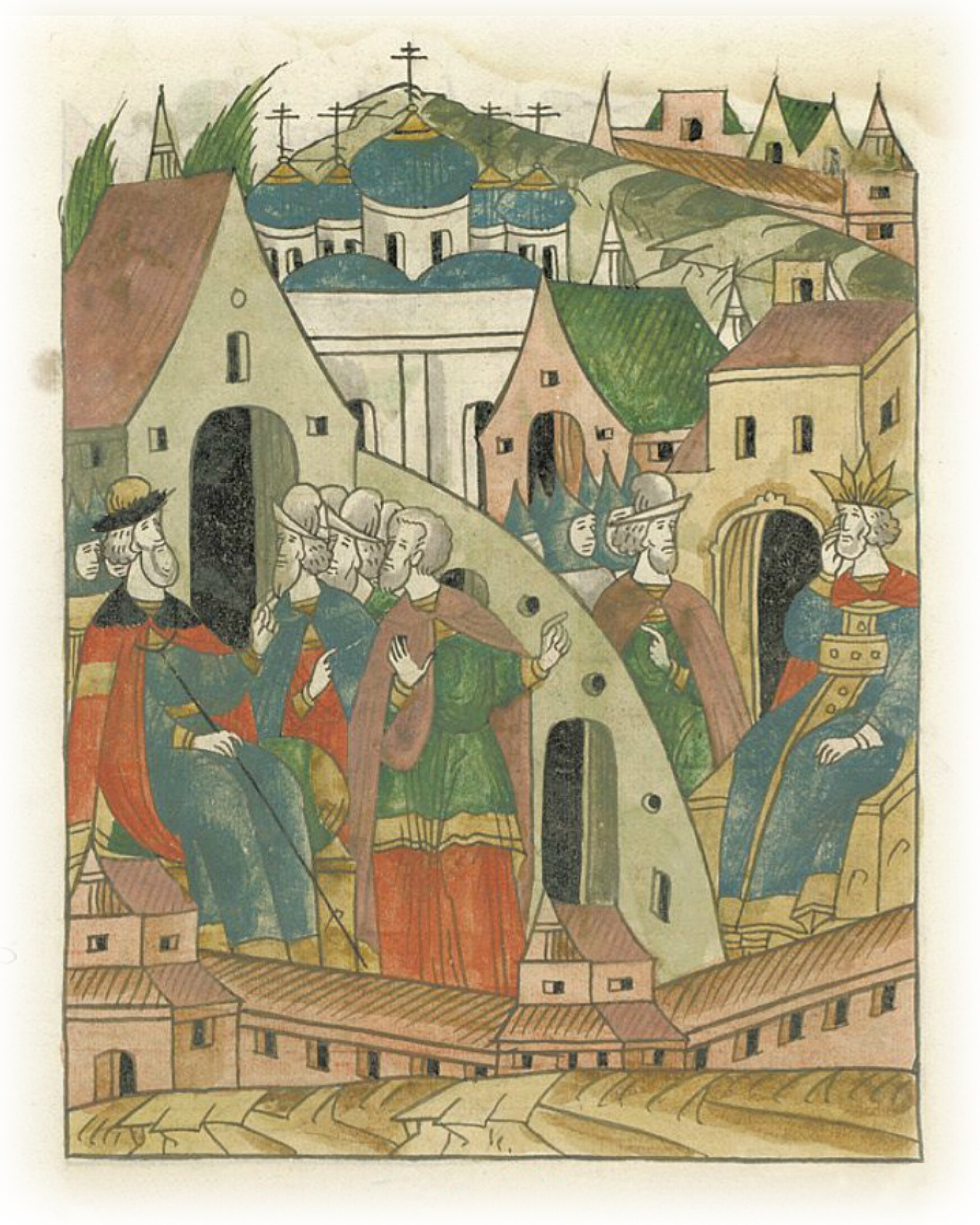 Ругодивские посадники Яким и Захар приезжают в Москву. Воеводы царя Ивана Васильевича Алексей Адашев и Иван Михайлов сообщают им, что государь пожалует их, если сдадут его воеводам помимо Ругодива Вышгород.