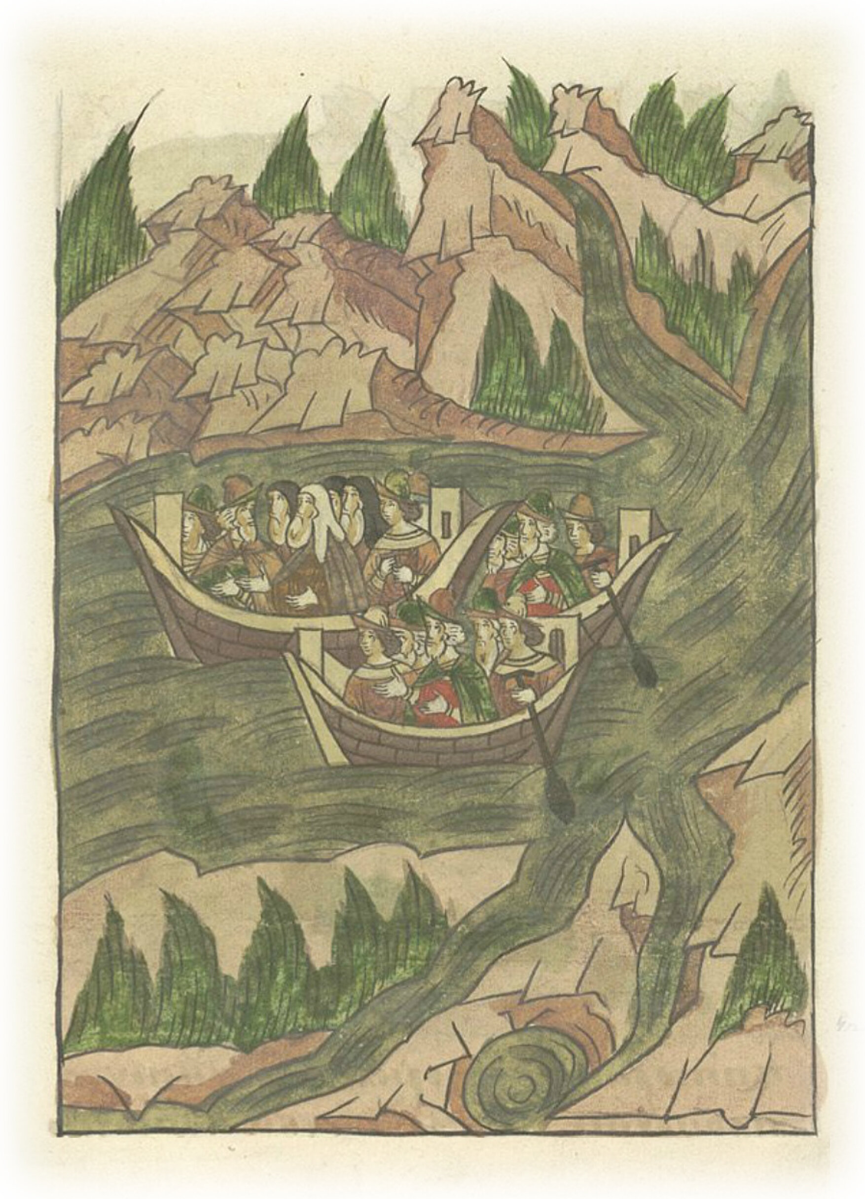 В неделю же пятую о Самаряныне минули, плывя, реку Медведицу и реку Горы Высокие, и реку Белый Яр. В понедельник же, плывя, минули горы Каменные красные.