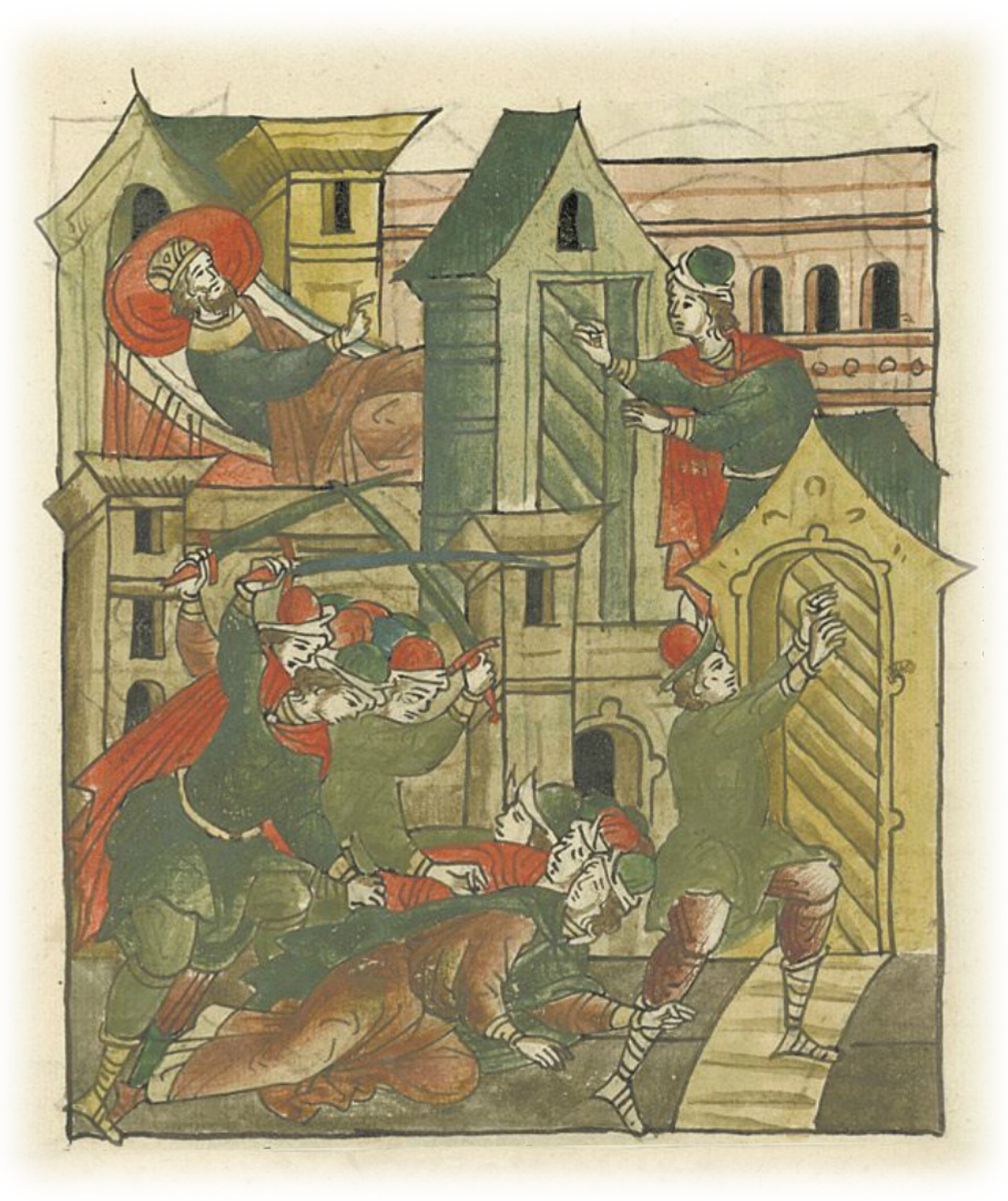 Убийство великого князя Андрея Юрьевича Боголюбского во Владимире Кучковичами. Убийцы, придя на двор князя, убивают сторожей. Один молодой пленник входит в спальню князя и зовет его.