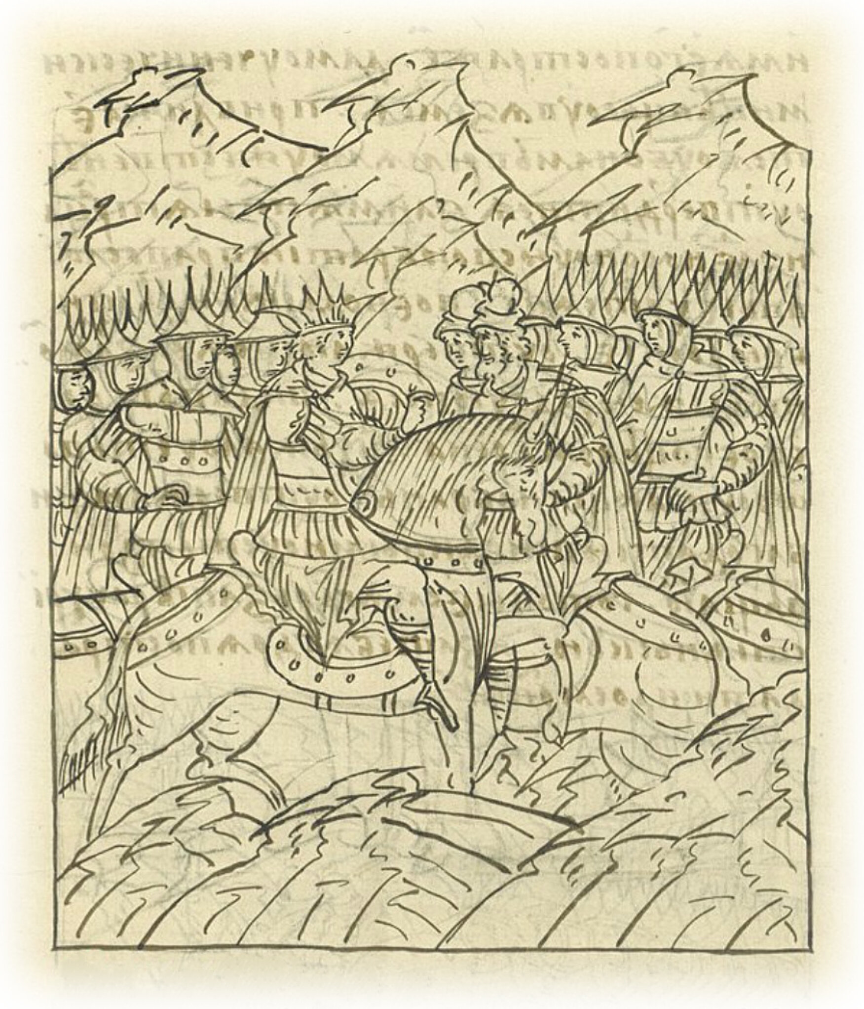 и воеводам в полках, в большом полку и в прочих, воеводам государь приказывает также готовиться на битву и рассмотреть воинов. Воевод же и боярских детей государь жалует и словом укрепляет, да не постыдятся против агарян, и говорит: «Агаряне Бога не имеют и воздаяния не ждут; мы же имеем Владыку Своего Господа Бога: если за имя Его пострадаем, мученическими венцами увенчаемся, приближается нам время мужественно утвердиться во имя Святой Троицы и за единородных своих братьев, православных христиан». Воеводы же и боярские дети укрепились разумом и надеждой радуются, видя своего целомудренного государя, который их жалует, готовясь к брани, утверждаясь благодатью, все едиными устами государю отвечают: «Готовы, государь, за христианскую веру и за тебя, государя, пострадать, даже и до смерти».