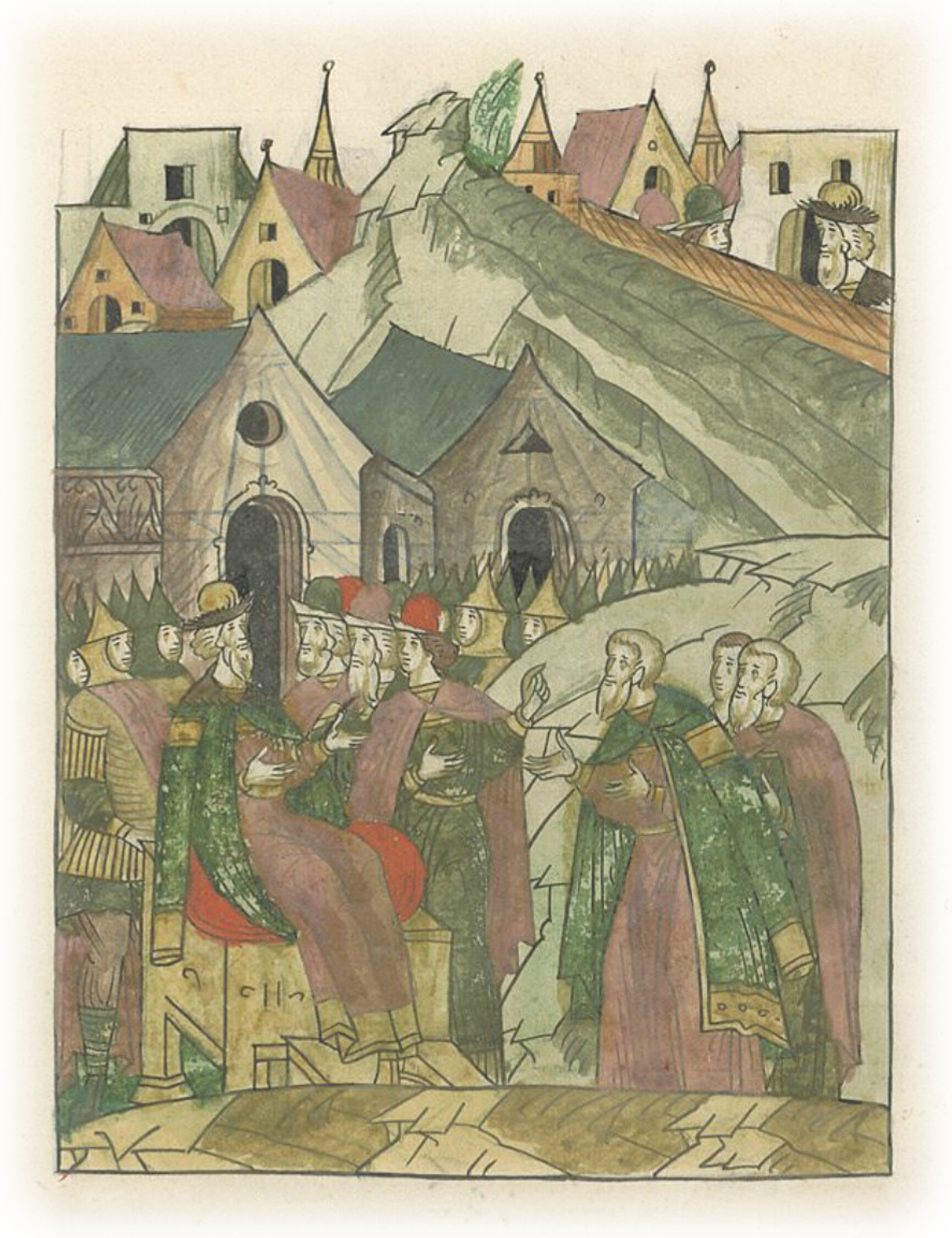 Ругодивские посадники Яким и Захар приезжают в Москву. Воеводы царя Ивана Васильевича Алексей Адашев и Иван Михайлов сообщают им, что государь пожалует их, если сдадут его воеводам помимо Ругодива Вышгород.