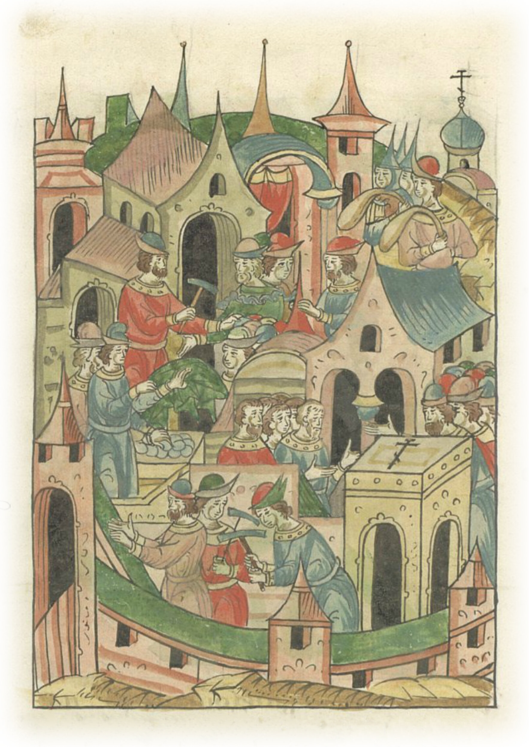 И прочих единомышленников князя Дмитрия и князя Ивана ловили, грабили и заковывали (в железа). А горожан привели к целованию великому князю Василию и начали город укреплять.