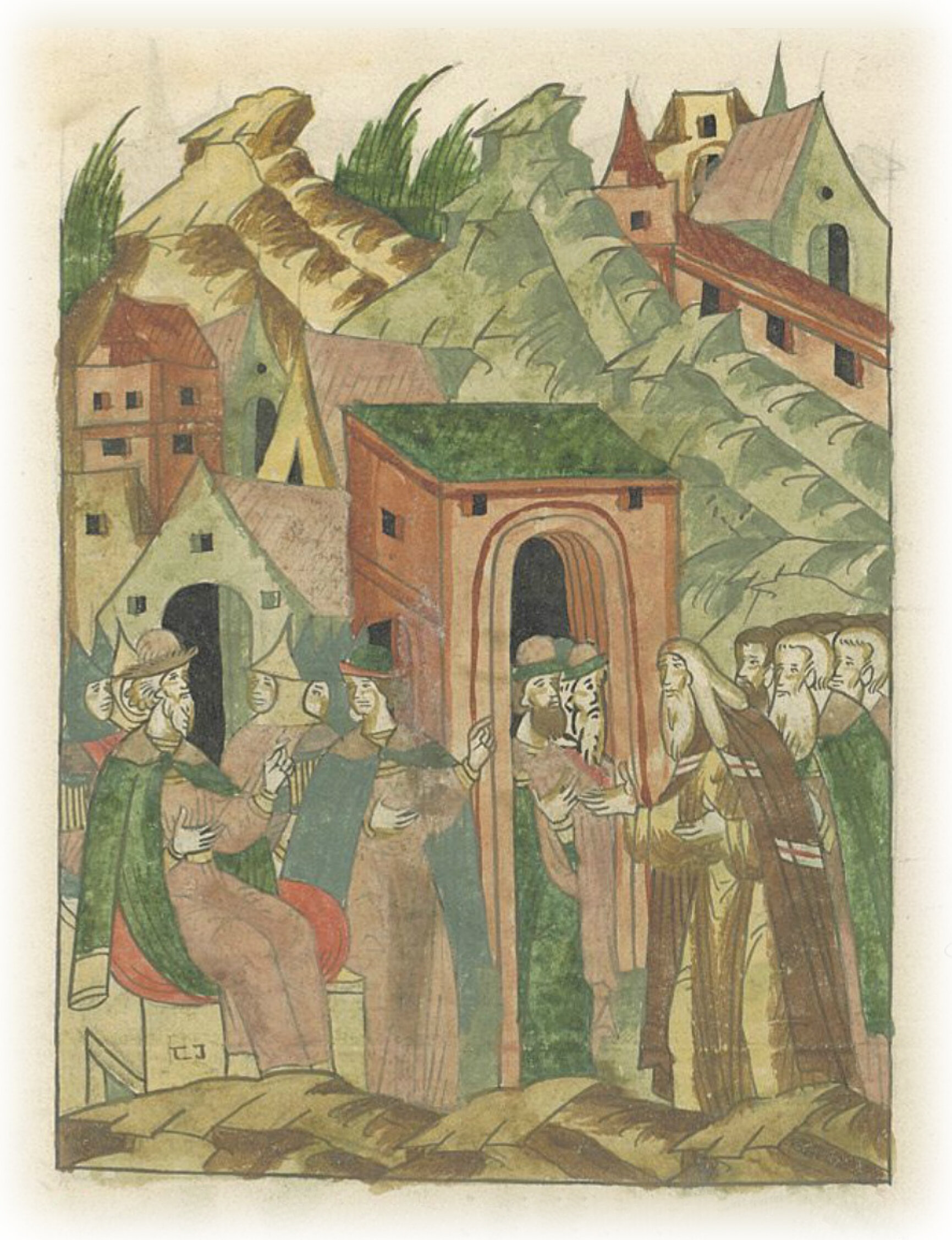 Новгородский владыка Феофил, посадники и зажиточные горожане приходят к великому князю и просят переговоров с боярами.