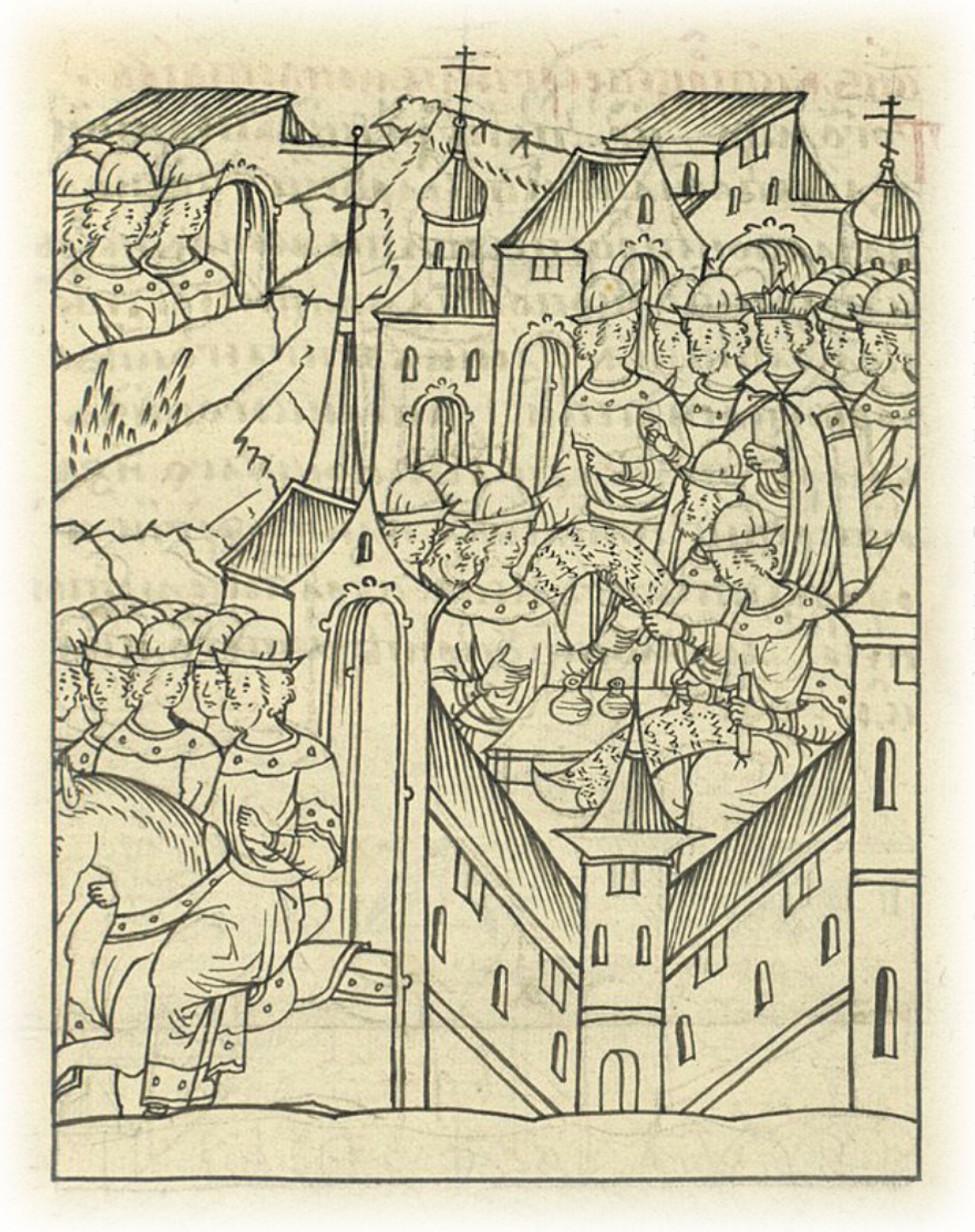 Языки говорят воеводам царя Ивана Васильевича, что магистр окопался большим рвом вокруг города Рындола, бьет из пушек и пищалей и приступает к Рындолу.